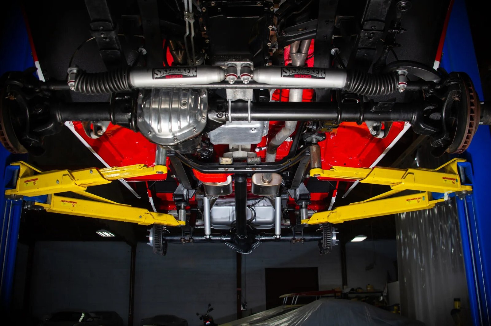 The 15″ Rally wheels are mounted with 33×12.5″ BFGoodrich All Terrain tires. The truck is equipped with power steering and Mile Marker manually locking front hubs. Braking is provided by power-assisted front disc and rear drums. Skyjacker steering stabilizers and Rough Country shocks have been added. An E-Stopp electronic parking brake kit was installed in November 2023.