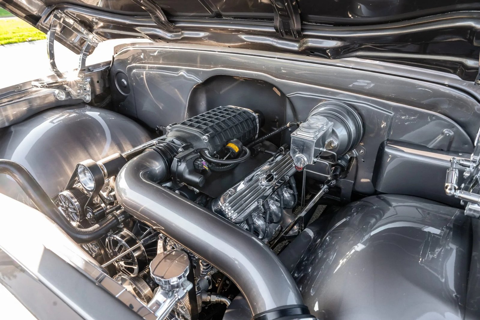 The fabricated inner fenders and firewall were smoothed prior to the installation of the Magnuson TVS2300-supercharged 6.2-liter LS3 V8. Equipment includes a Concept One billet serpentine system, Billet Specialties valve covers, ceramic-coated exhaust manifolds, Ringbrothers billet hood hinges, and a polished radiator with a Cooling Components 16″ electric fan.