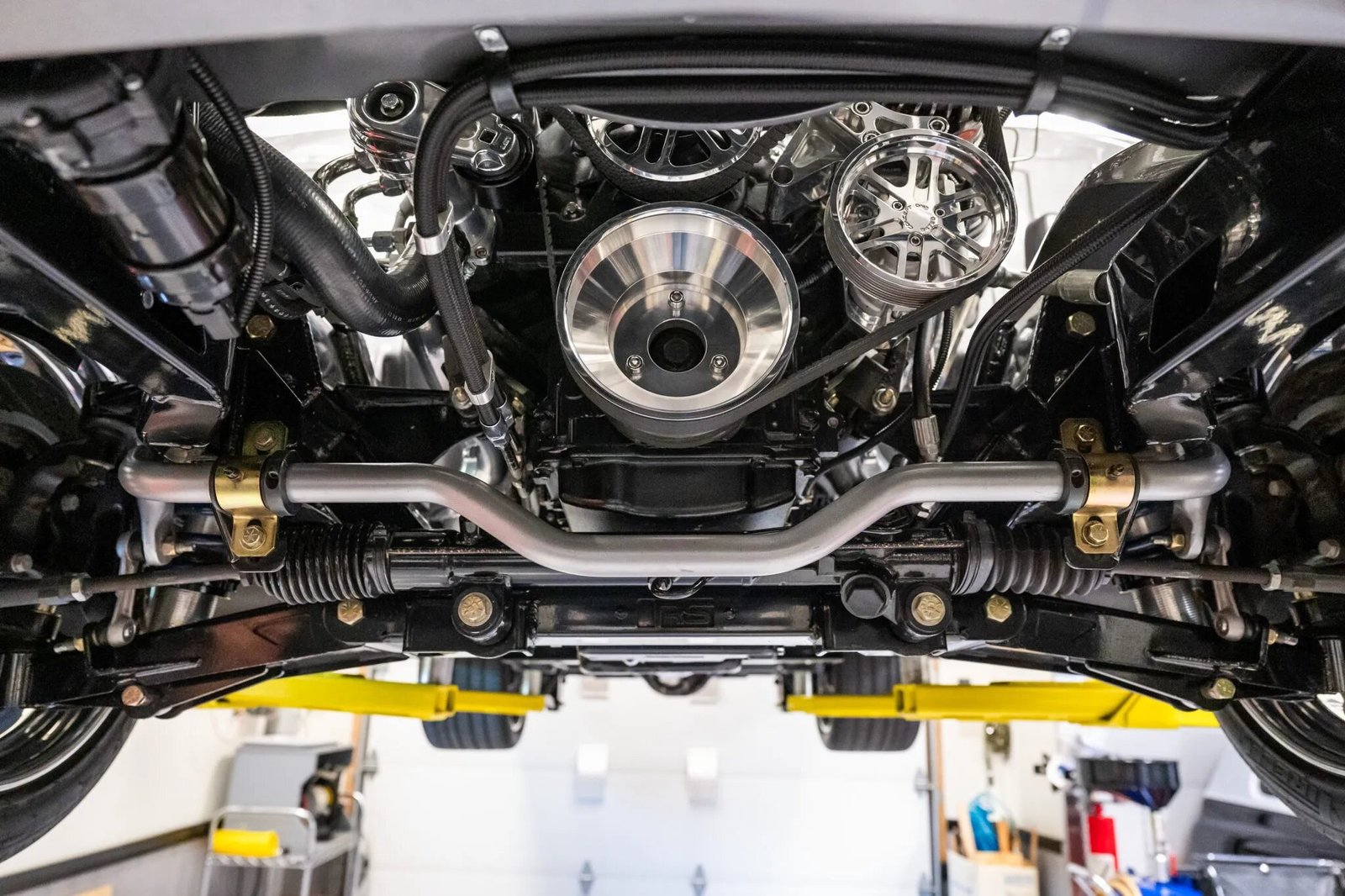 Power is routed to the rear wheels through a 4L70E four-speed automatic transmission and 9″ rear axle with 3.50:1 gears. The ceramic-coated dual exhaust system features a crossover pipe and MagnaFlow mufflers. A custom aluminum driveshaft, a Rick’s Tanks stainless steel fuel tank, and an in-tank fuel pump have been fitted.