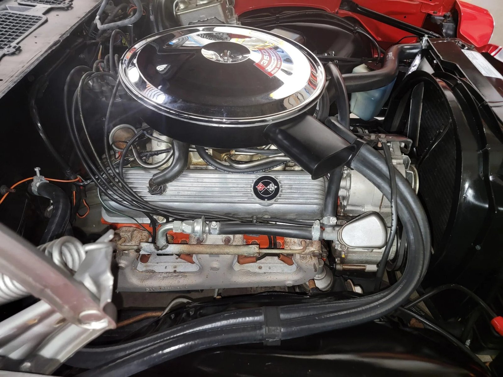 The body came finished from the factory in Cranberry Red and features white racing stripes on the hood, rear deck, and rear spoiler.