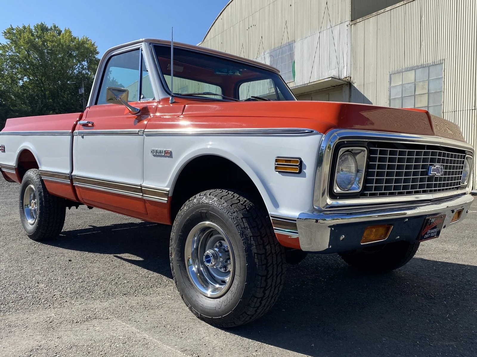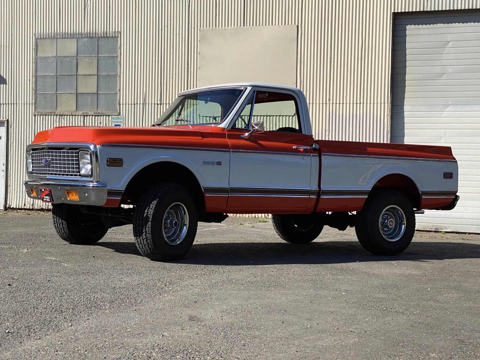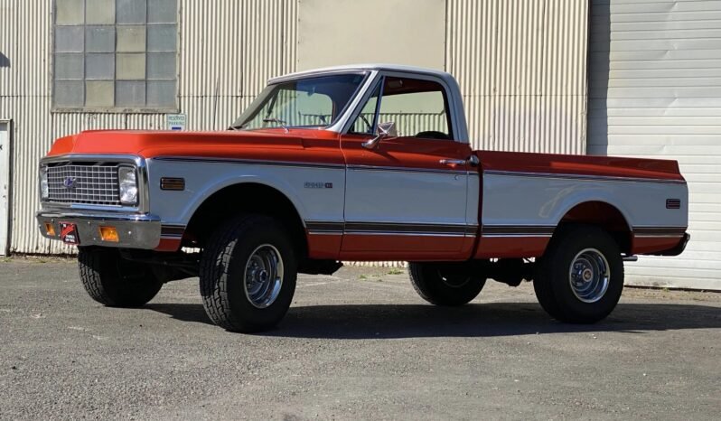 This 1972 Chevrolet K10 is a 4×4 Fleetside pickup, work included repairing corrosion, repainting the truck in orange and white, reupholstering the interior, and overhauling the brakes, suspension, and drivetrain. Power is provided by a 350ci V8 paired with a three-speed automatic transmission and a dual-range transfer case, and features include 15″ wheels, front disc brakes, locking front hubs, bucket seats, and air conditioning.
