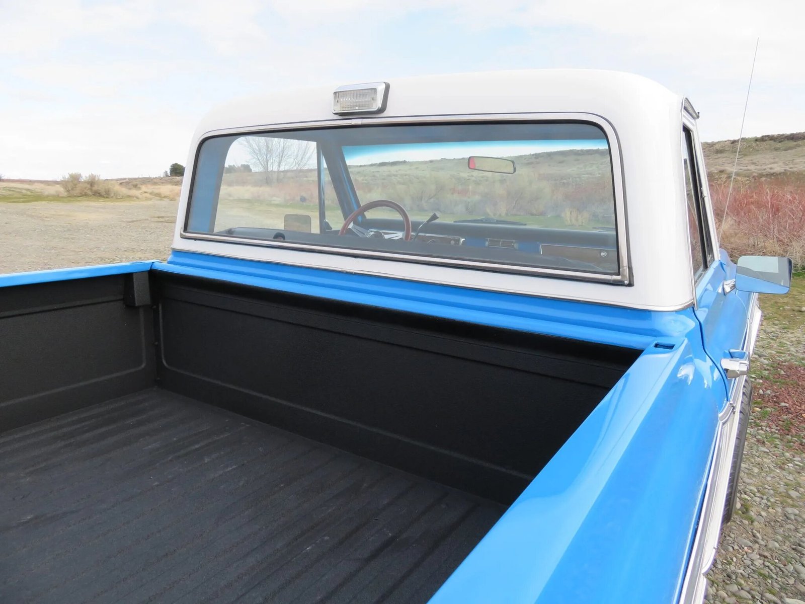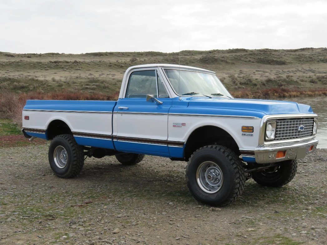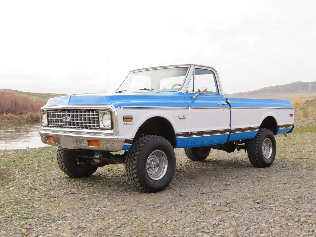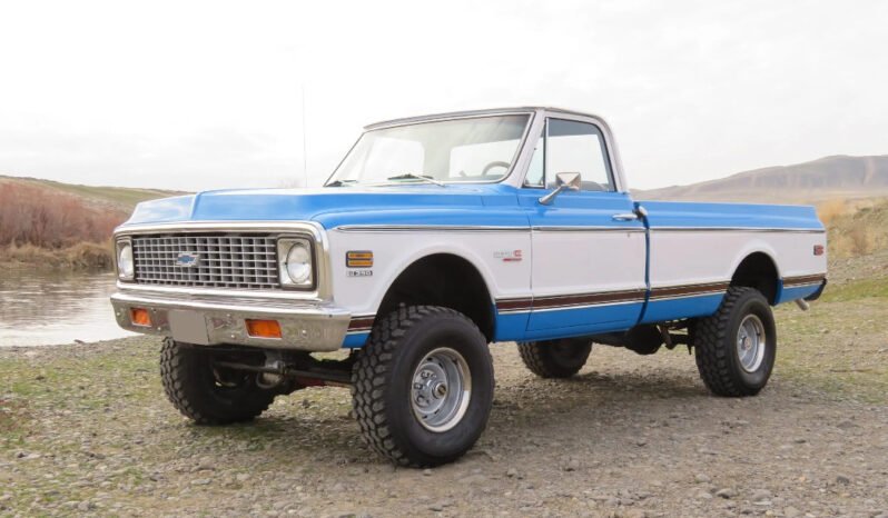 The truck is finished in medium blue and white over blue and is powered by a 350ci V8 paired with three-speed automatic transmission and a two-speed transfer case.