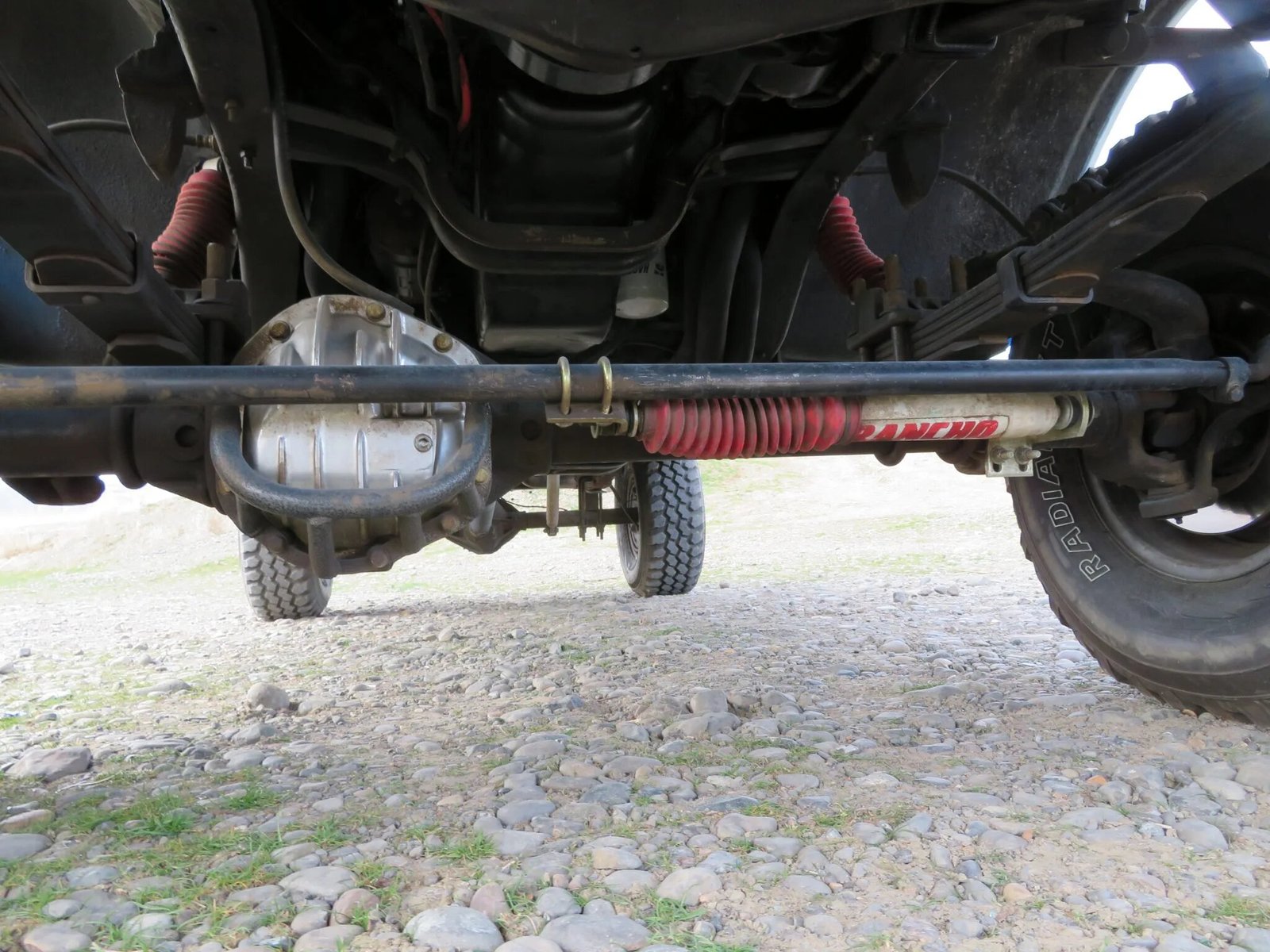 Silver 15″ steel wheels wear beauty rings and 33″x12.5″ Mudstar Radial M/T tires.
