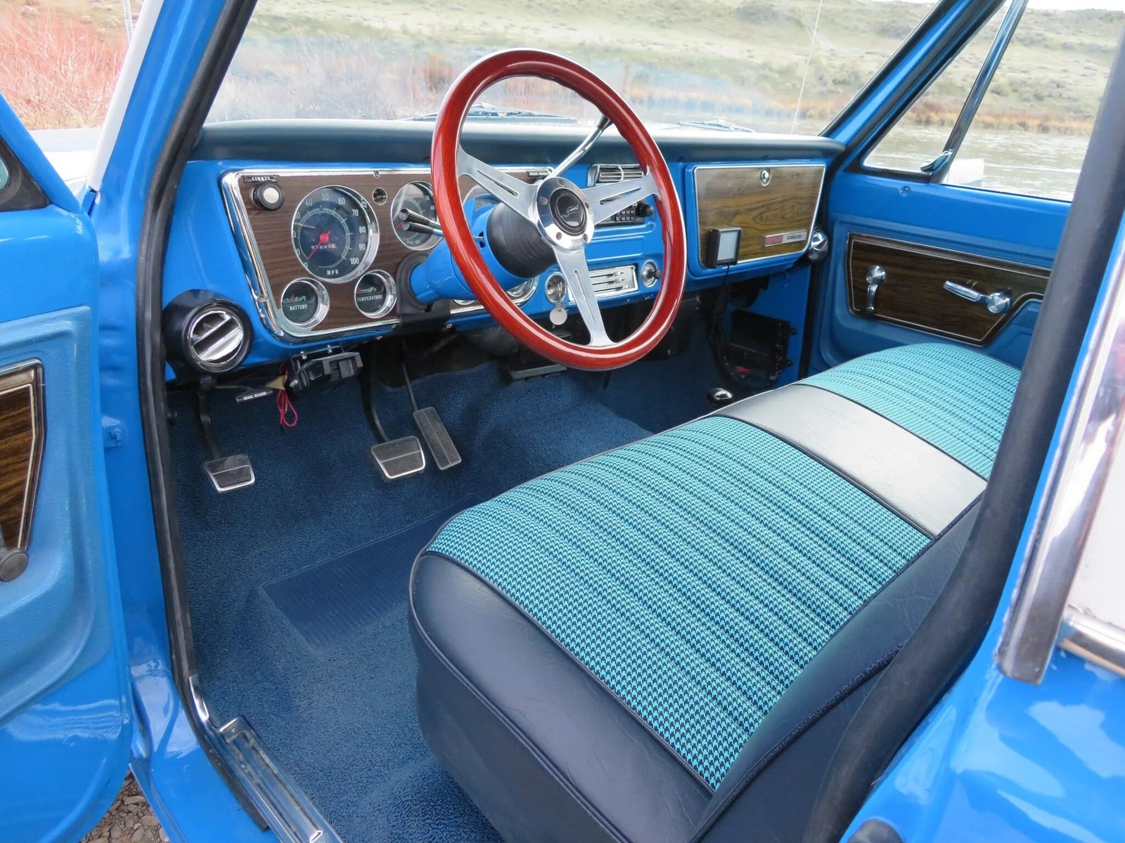 The cab is equipped with the Cheyenne trim level and features a bench seat covered in blue vinyl and houndstooth fabric.