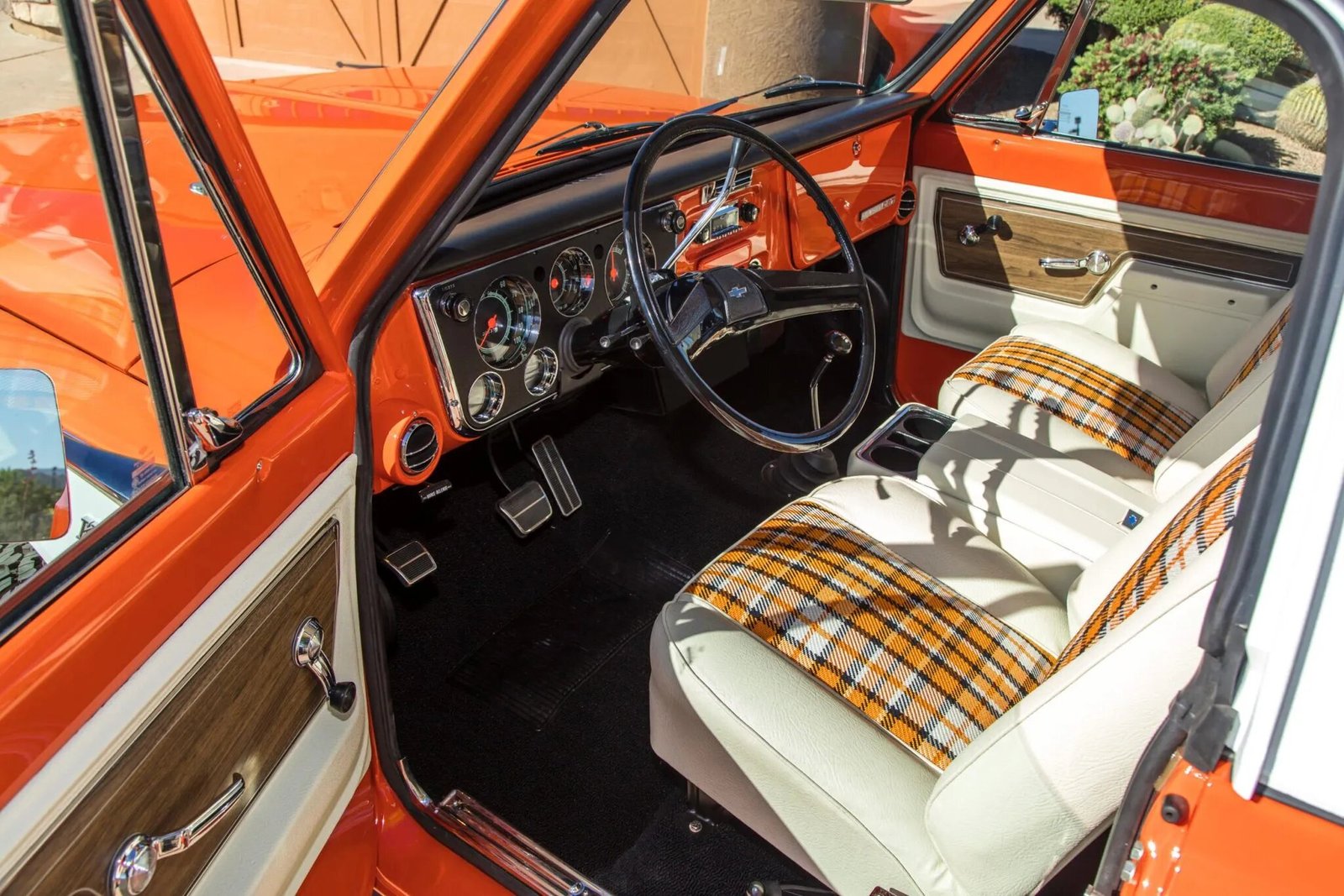 The truck left the factory finished in red-orange and was previously finished in black prior to being sandblasted and repainted in the current orange-and-white scheme between 2021 and 2023. Additional work completed during this time included installing Mar-K woodgrain trim and moldings and Altman door latches as well as replacing the doors, rocker panels, tailgate, tinted glass, and rubber seals. Exterior details consist of a removable white hardtop, an egg-crate grille, a drop-down tailgate, chrome bumpers, and dual exhaust outlets.