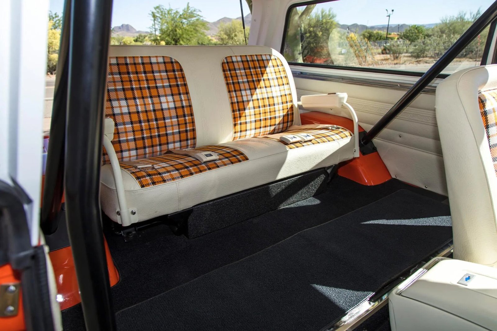 The seat frames were sandblasting and powder-coated and replacement seat foam was fitted before the front bucket seats and rear bench were reupholstered in white and orange Highlander-style covers during the refurbishment. Further work included replacing the floors, control knobs, wiring, lighting, and internal hatch components. Appointments include air conditioning, a retro-style stereo, a center console, and CST badging.