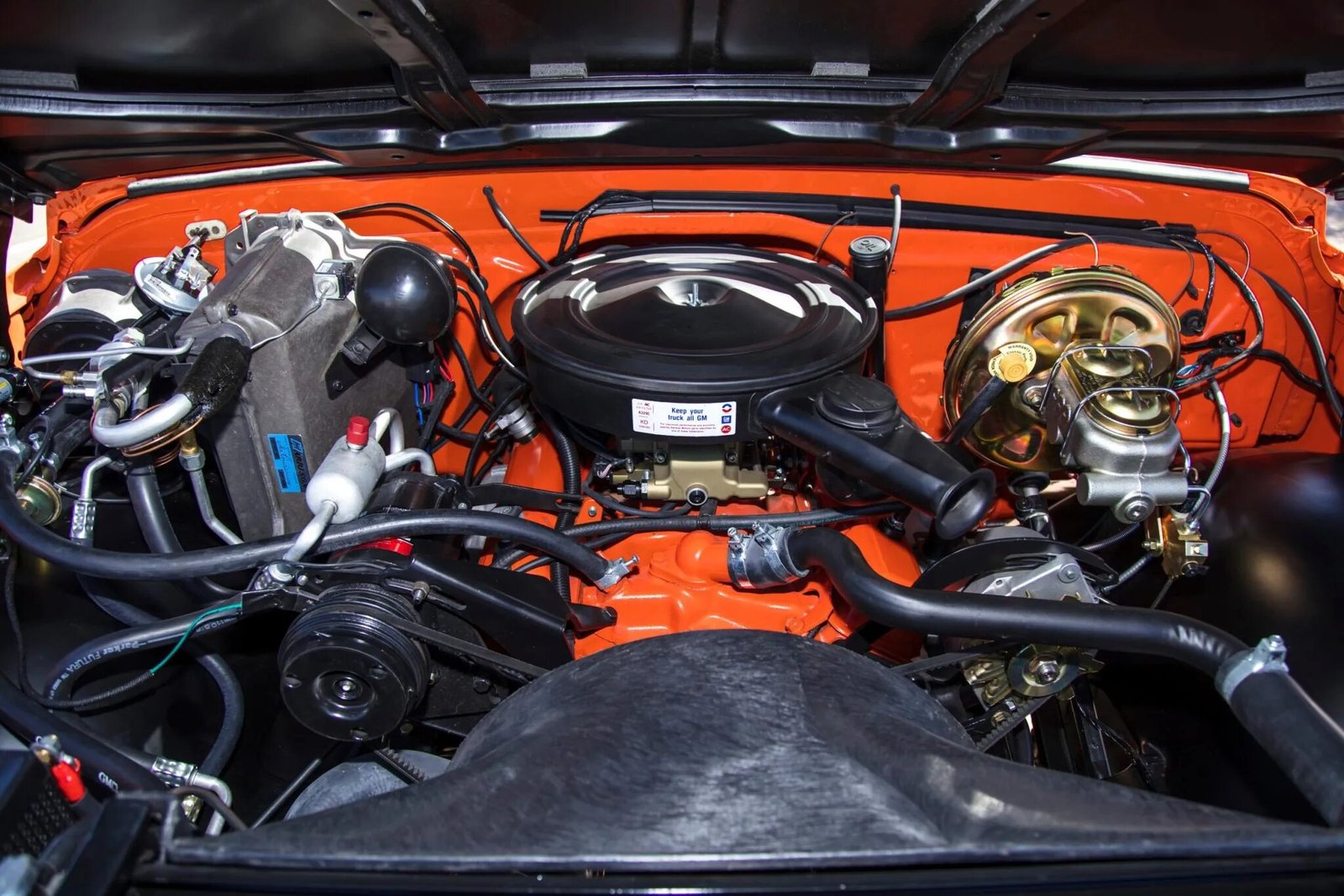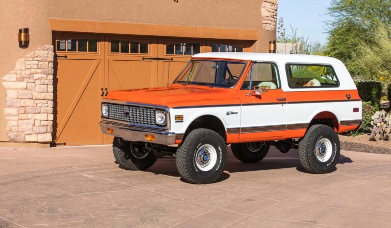 This 1972 K5 Blazer CST 4x4 underwent a multi-year refurbishment completed by RustyK5, in 2023. Work included refinishing the truck in red-orange and white, fitting Mar-K exterior trim, and powder-coating the seat frames before fitting replacement foam and orange and white Highlander-style covers. Power is provided by a rebuilt 350ci V8 that drives the rear or all four wheels through a three-speed automatic transmission, a dual-range transfer case, and a PosiTraction rear differential with 3.73:1 gearing. The truck rides on an OffRoad Design lift kit and 15″ steel wheels with 35″ BFGoodrich tires. Additional equipment includes a removable hardtop, Holley Sniper fuel injection, front disc brakes, air conditioning, and a retro-style stereo.