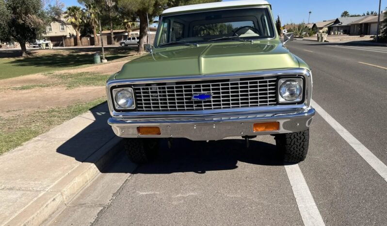 This 1972 Chevrolet K5 Blazer CST was refinished in green and white over white vinyl and plaid cloth upholstery as part of a refurbishment completed in 2023. Additional work completed at that time included replacing the windows, bumpers, grille, side moldings, body mounts, and weather seals, rebuilding the axles, brakes, three-speed automatic transmission, and dual-range transfer case, and installing a replacement 350ci V8 with Holley electronic fuel injection. Equipment includes a removable white hardtop, 15″ Rally wheels, power-assisted front disc brakes, power steering, air conditioning, a rear bench seat, a center console, and a Custom Autosound digital stereo.