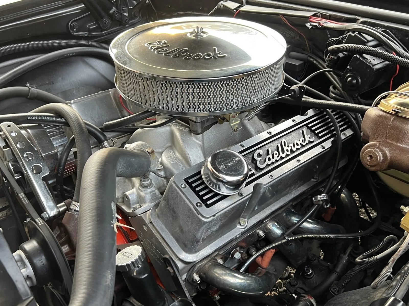 The replacement 350ci V8 is features Patriot Performance cylinder heads and an Edelbrock air cleaner and valve covers.