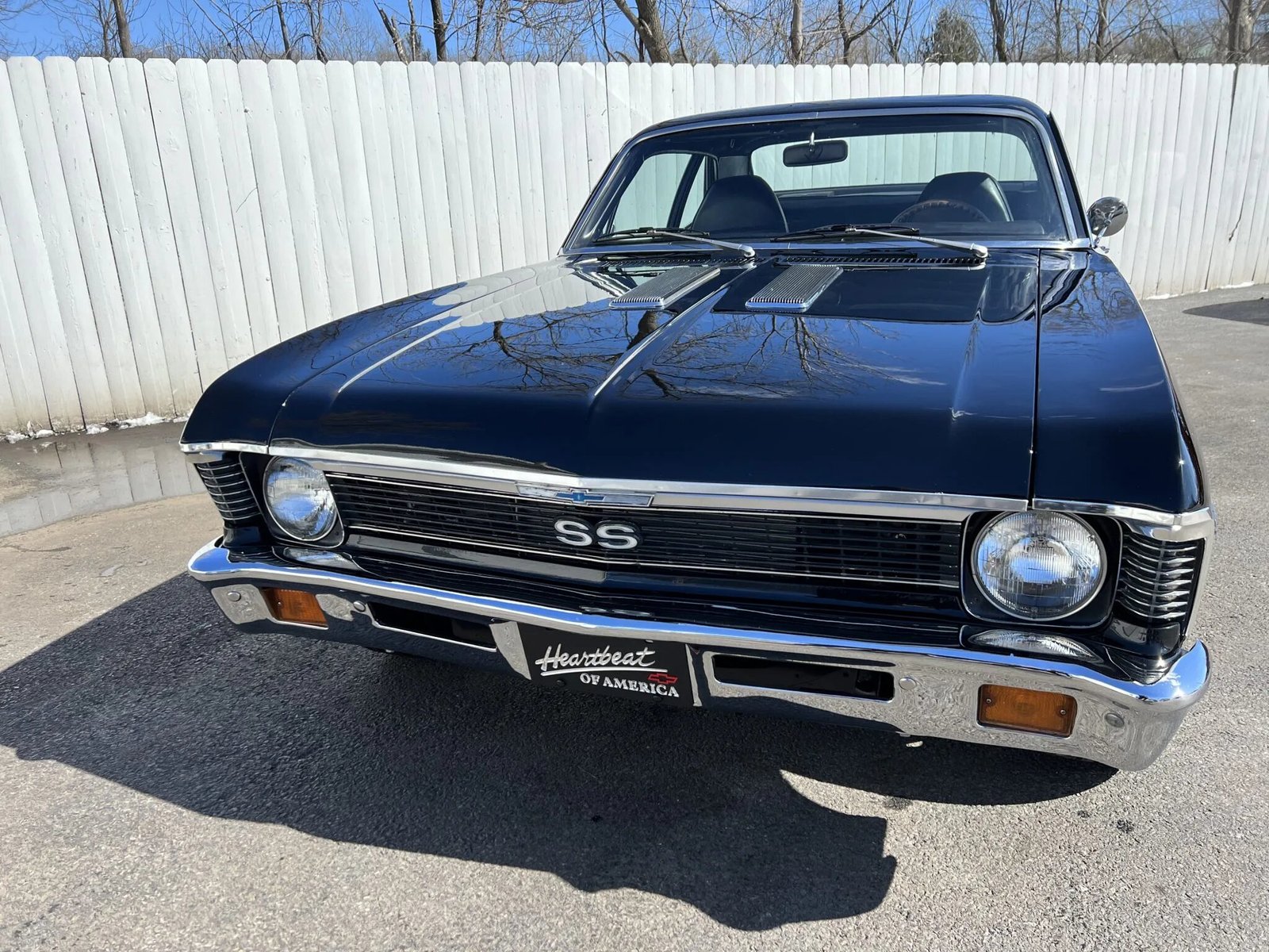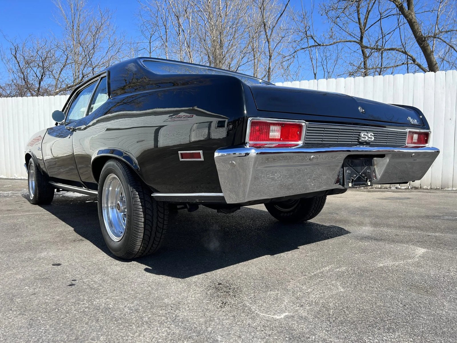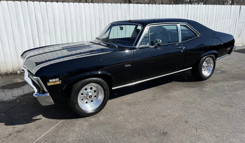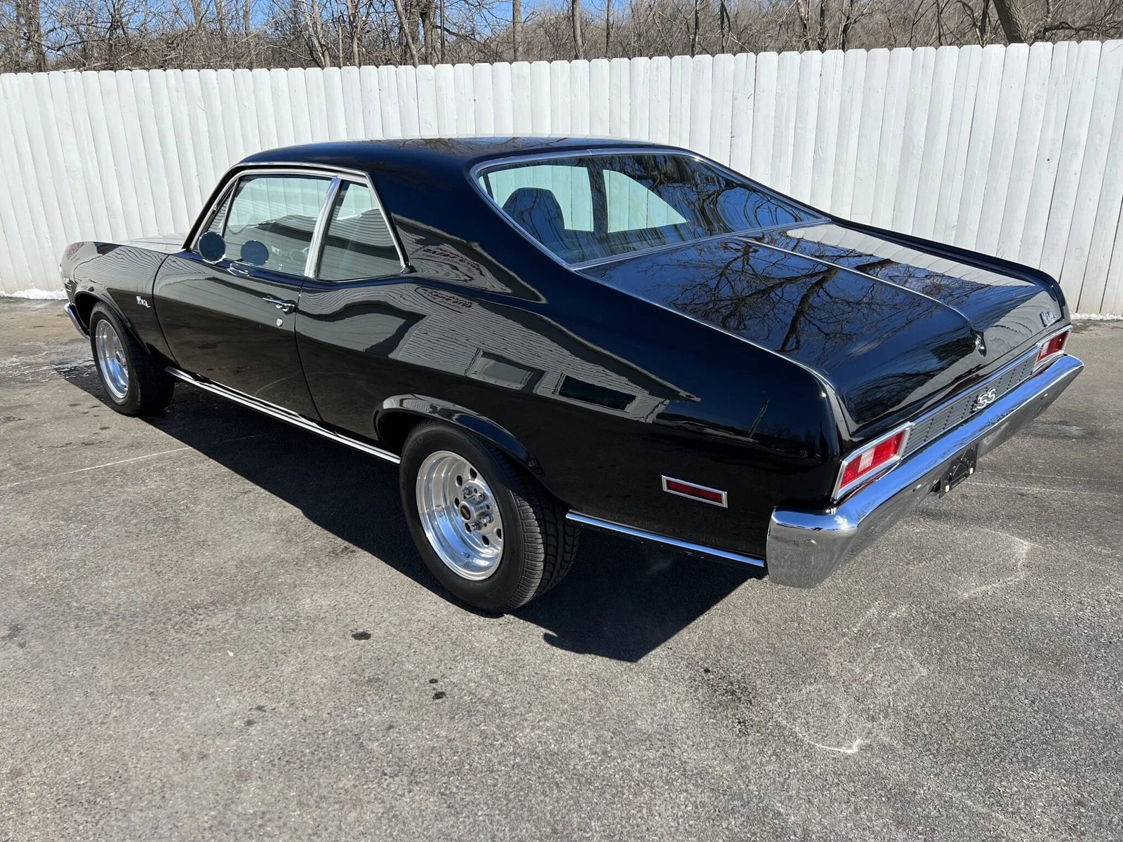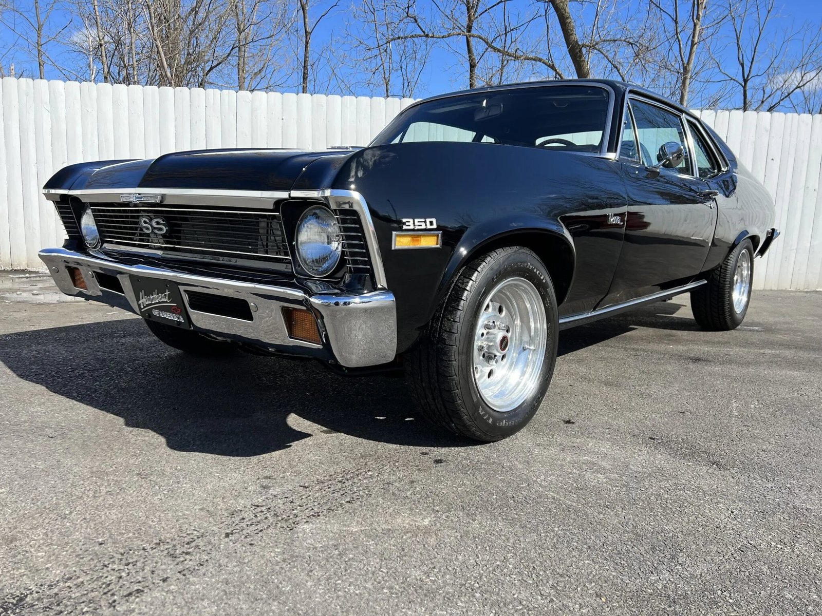 The car was refinished in black and features chrome bumpers and trim, dual side mirrors, hood vents, and Nova, 350, and SS badges.