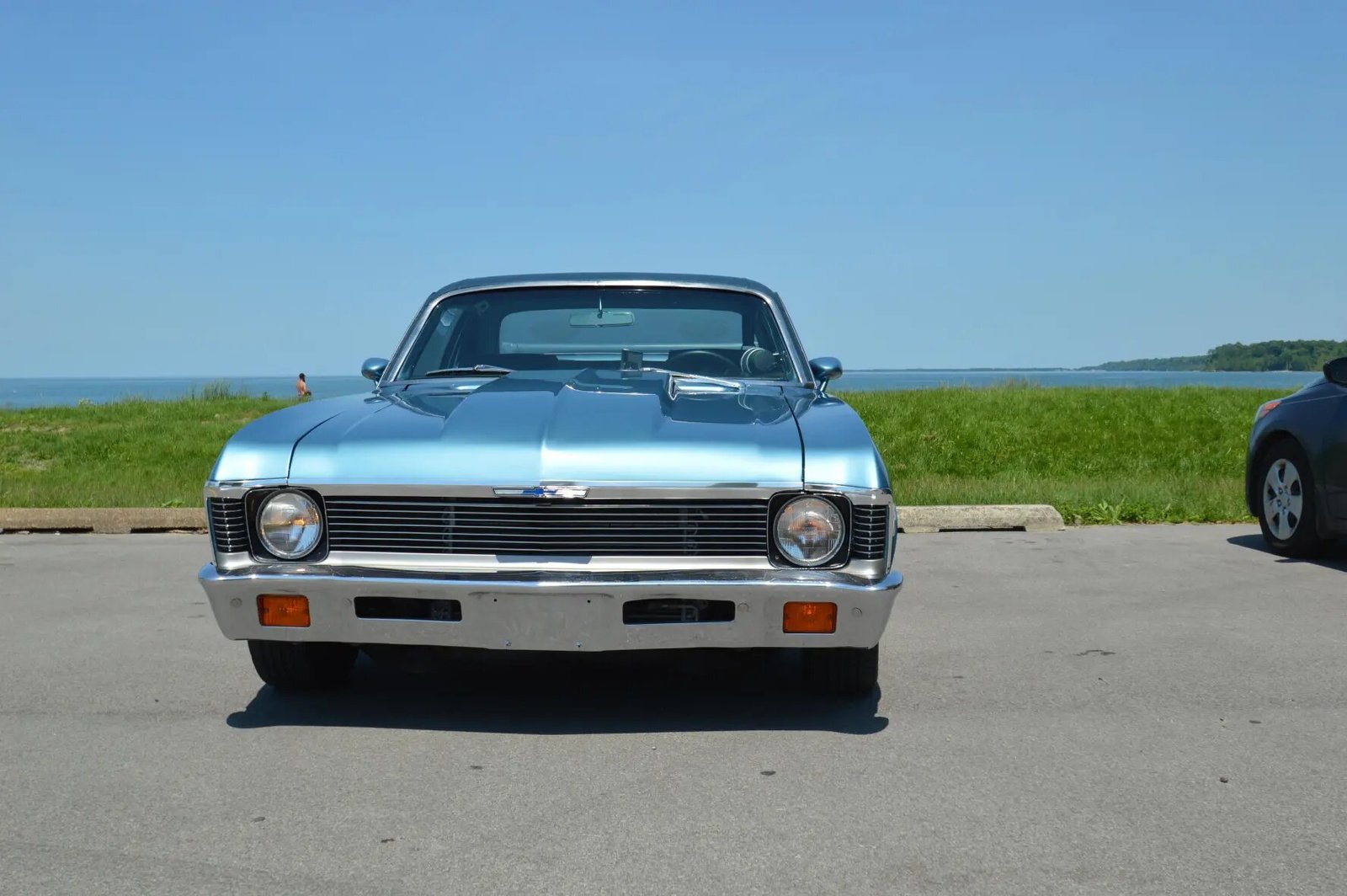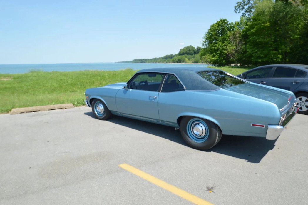 The car is finished in metallic blue with a blue vinyl roof covering.