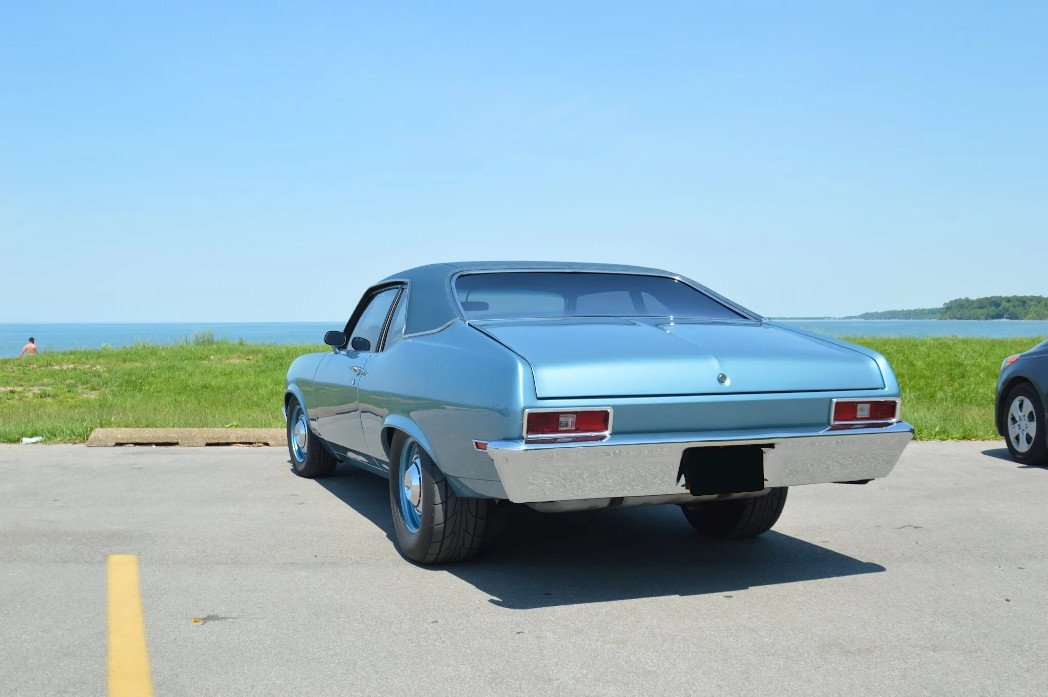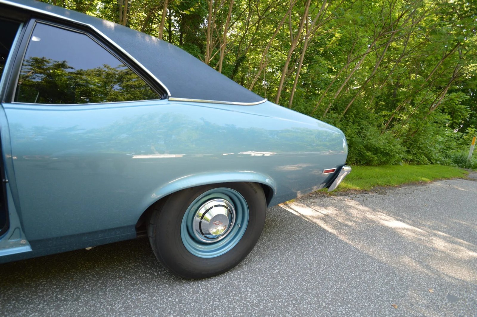 Blue-painted 14″ front and 15″ rear steel wheels with chrome hubcaps wear 195/70 Douglas All-Season and 275/60 Nitto NT555R Extreme Drag tires, respectively.