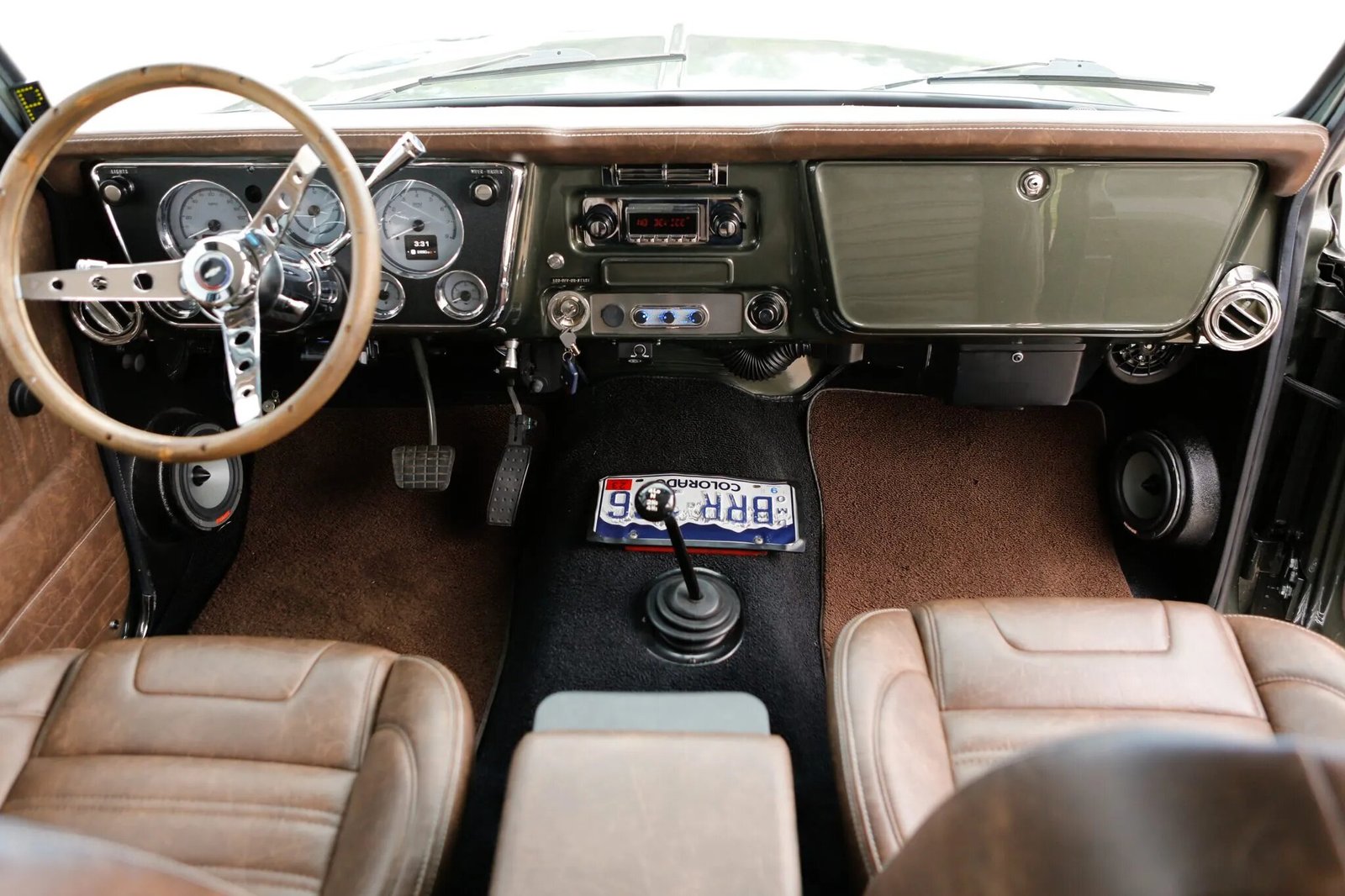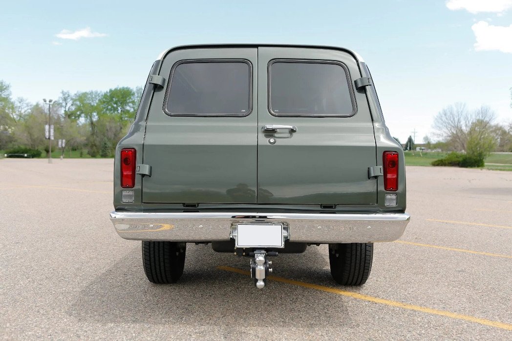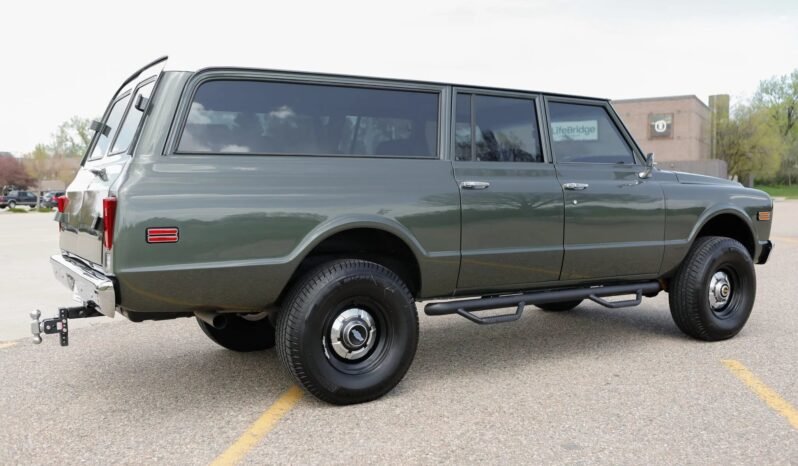 This 1972 Chevrolet Suburban is powered by a 6.2-liter LS3 V8 linked to a six-speed automatic transaxle and a dual-range transfer case and is finished in green with a white roof over distressed brown vinyl upholstery. Subsequent modifications include 16” steel wheels, one-ton springs, rear disc brakes, twin fuel tanks, a B&W drop hitch, Memphis Audio components, and a third-row bench seat. Additional equipment consists of Warn front locking hubs, Doug Thorley long-tube headers, a MagnaFlow exhaust system, a Dakota Digital instrumentation, Vintage Air air conditioning, and a RetroSound Bluetooth stereo.
