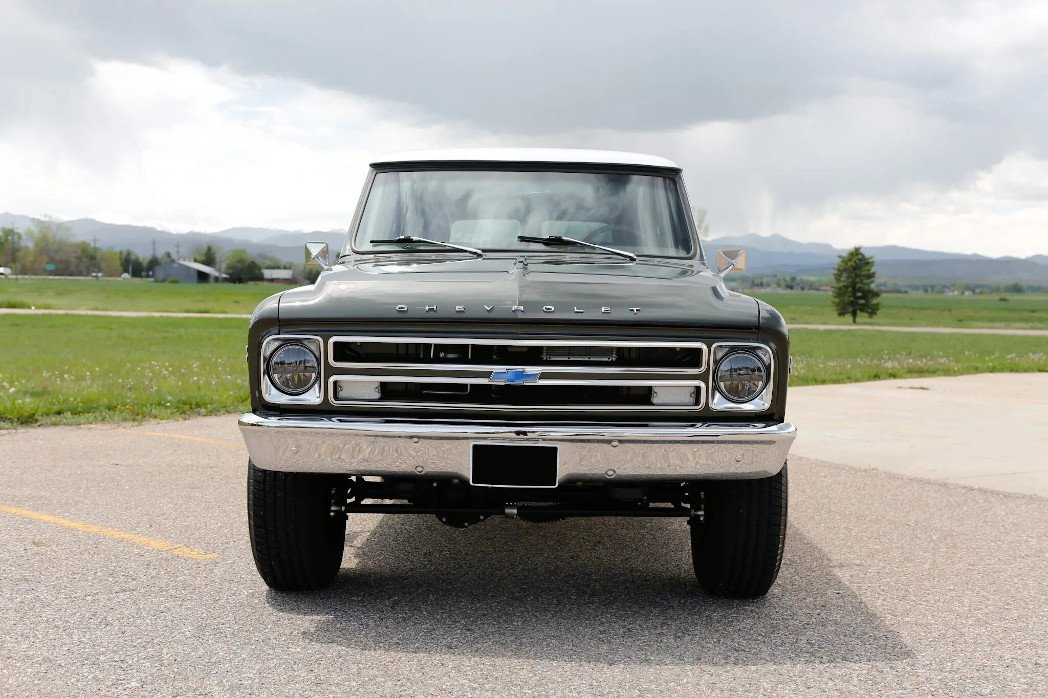 During refurbishment, the body was removed from the frame, stripped, and fitted with a 1967-style hood, grille, and headlight assemblies before being refinished in green with a white roof.