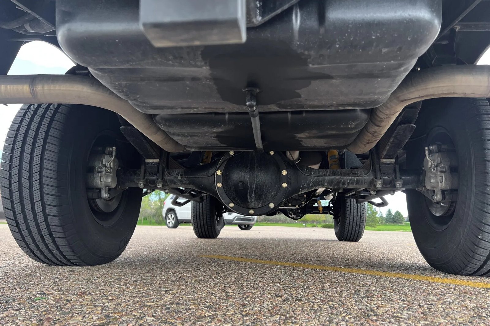 The factory 3/4-ton axles were overhauled, and the truck is equipped with Bilstein shocks, one-ton leaf springs, and Warn heavy-duty manually-locking front hubs.