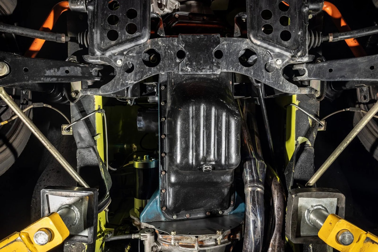 The car was finished from the factory in Lime Yellow (112) and received bodywork prior to a repaint during the aforementioned refurbishment. The tail panel is painted black, and H4 headlights along with chrome bumpers have been installed. Further exterior details include a front spoiler, door-mounted mirrors, polished trim, and twin exhaust tips.