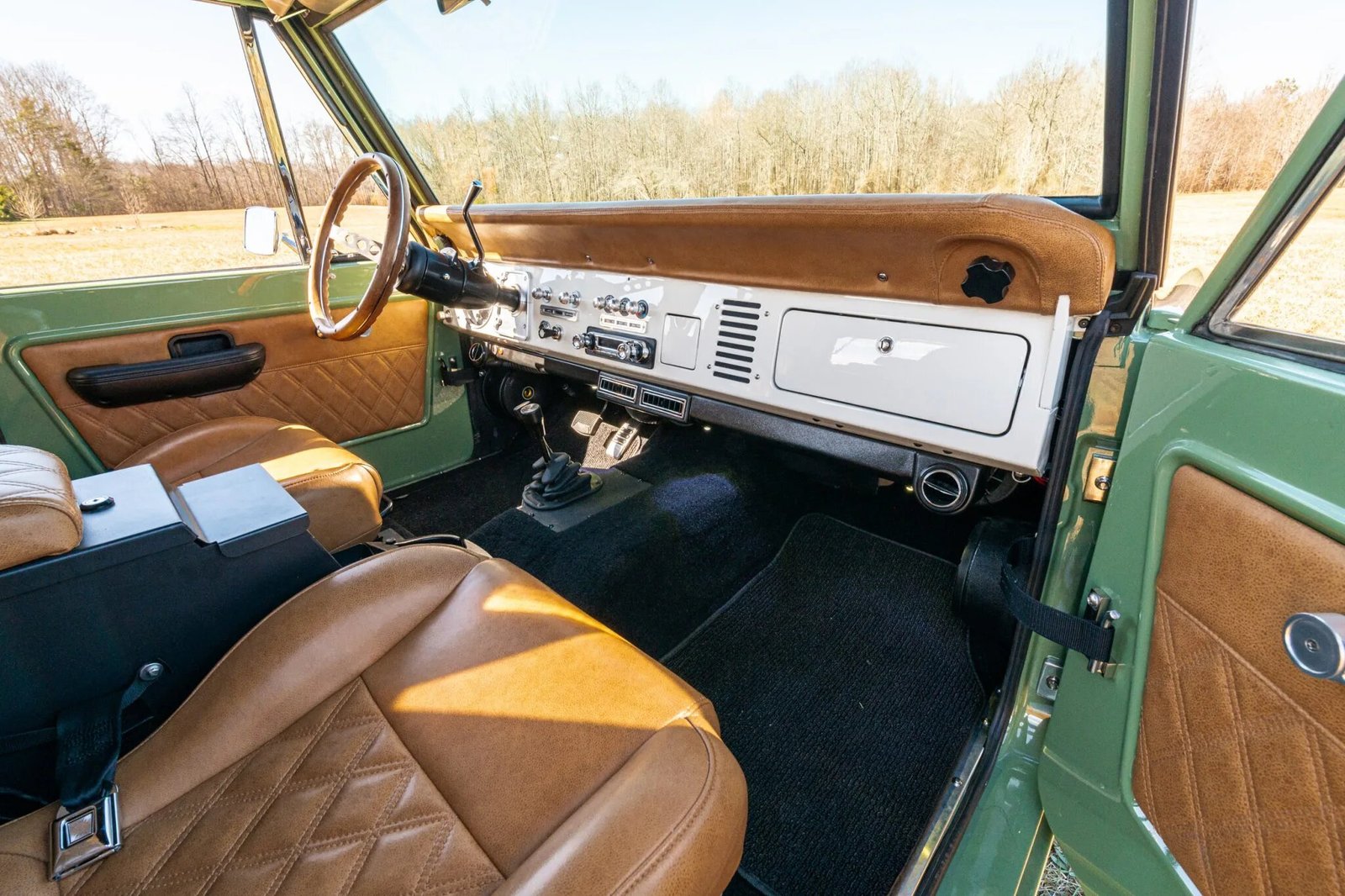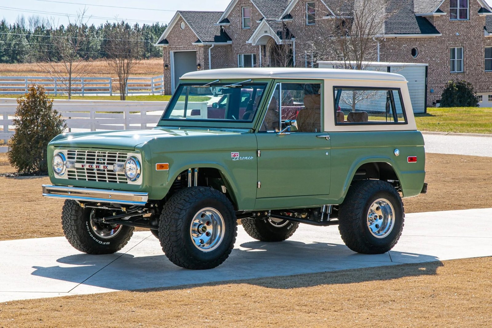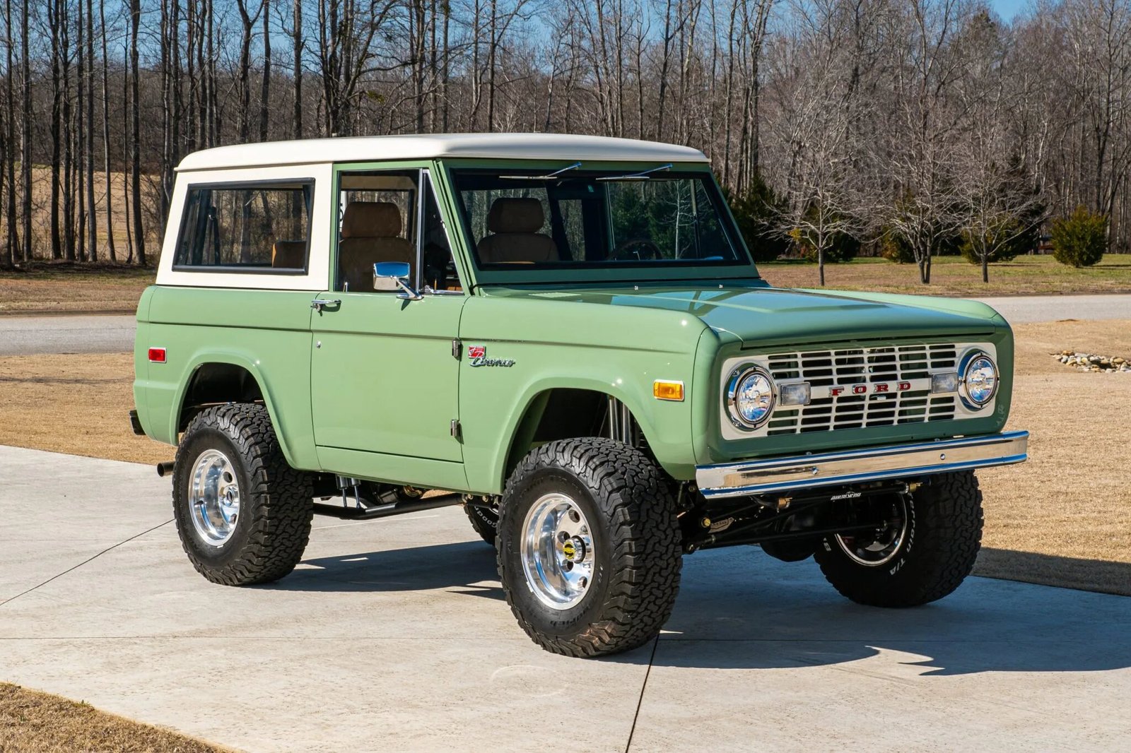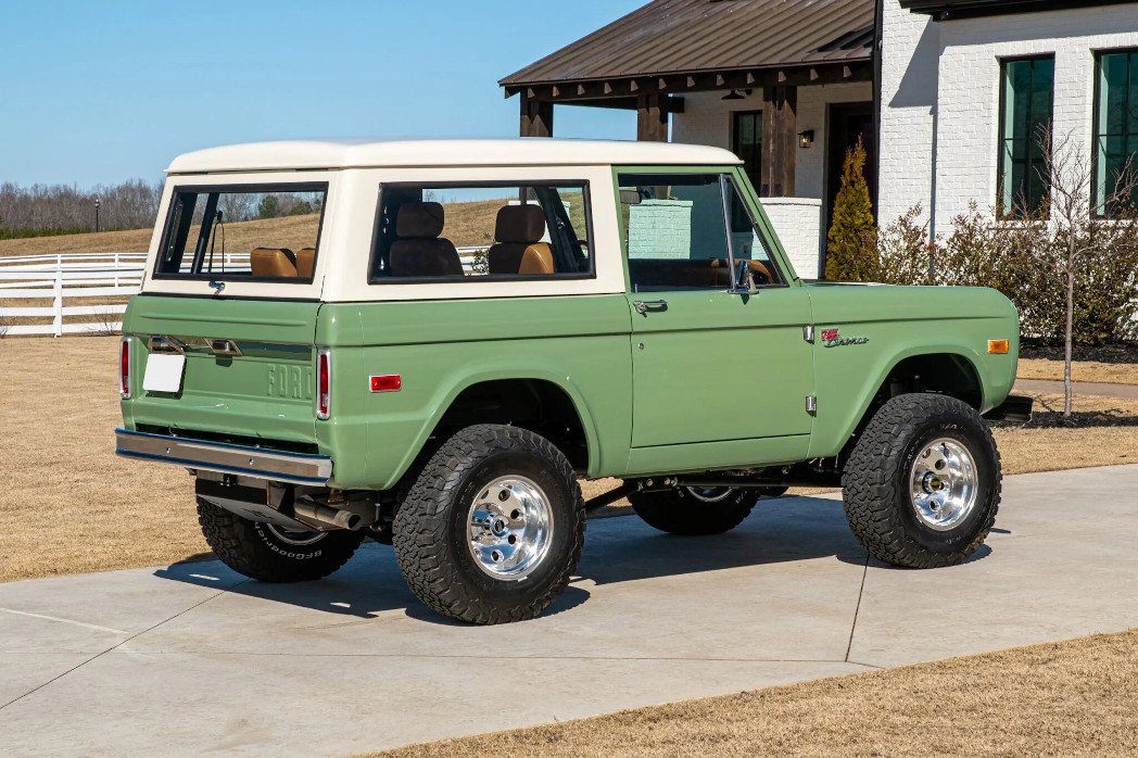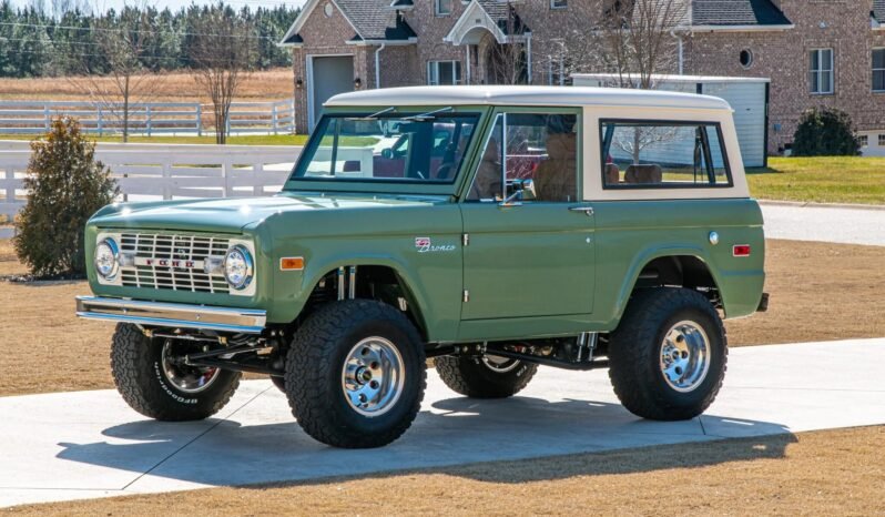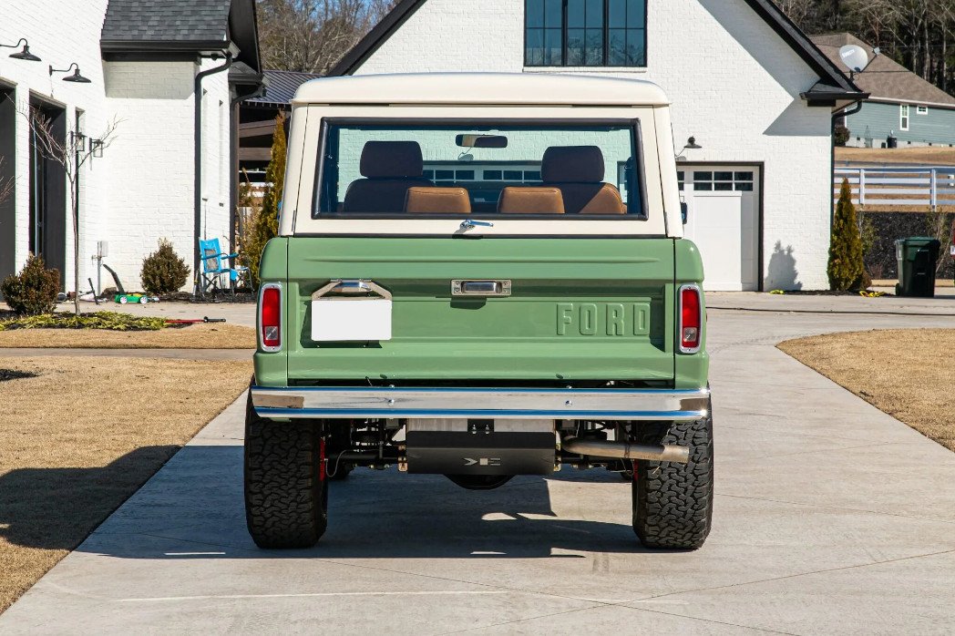 This 1972 Ford Bronco is finished in Boxwood Green over brown leather and powered by a 5.0-liter Coyote V8 paired with a ten-speed 10R80 automatic transmission and an Atlas II dual-range transfer case.