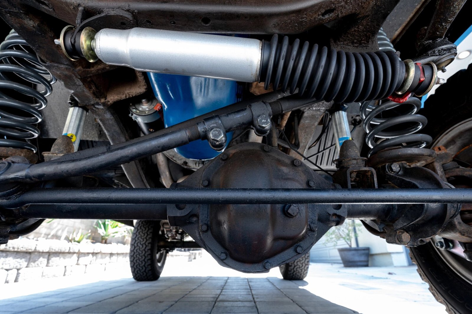 The suspension is equipped with a replacement steering stabilizer, U-joints, and ball-joints as well as a 3.5″ lift-kit utilizing Bilstein shocks and Mile Marker manually-locking front hubs.