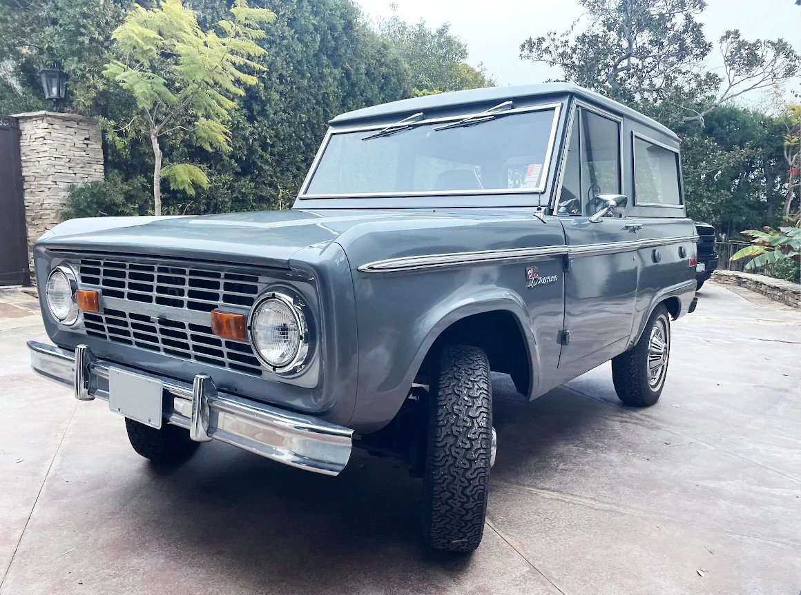 This 1972 Ford Bronco Sport was purchased in 2014 by film actor Hilary Swank, who has since added approximately 1k miles. The truck is powered by a 302ci V8 mated to a column-shifted three-speed manual transmission and a dual-range transfer case, and it has been refinished in silver over gray vinyl upholstery. Equipment includes a silver-finished removable hardtop, a left-side mirror, a bumper-mounted hitch ball mount, dual fuel tanks, 15″ wheels, manually locking front hubs, and an AM/FM radio with an eight-track player.