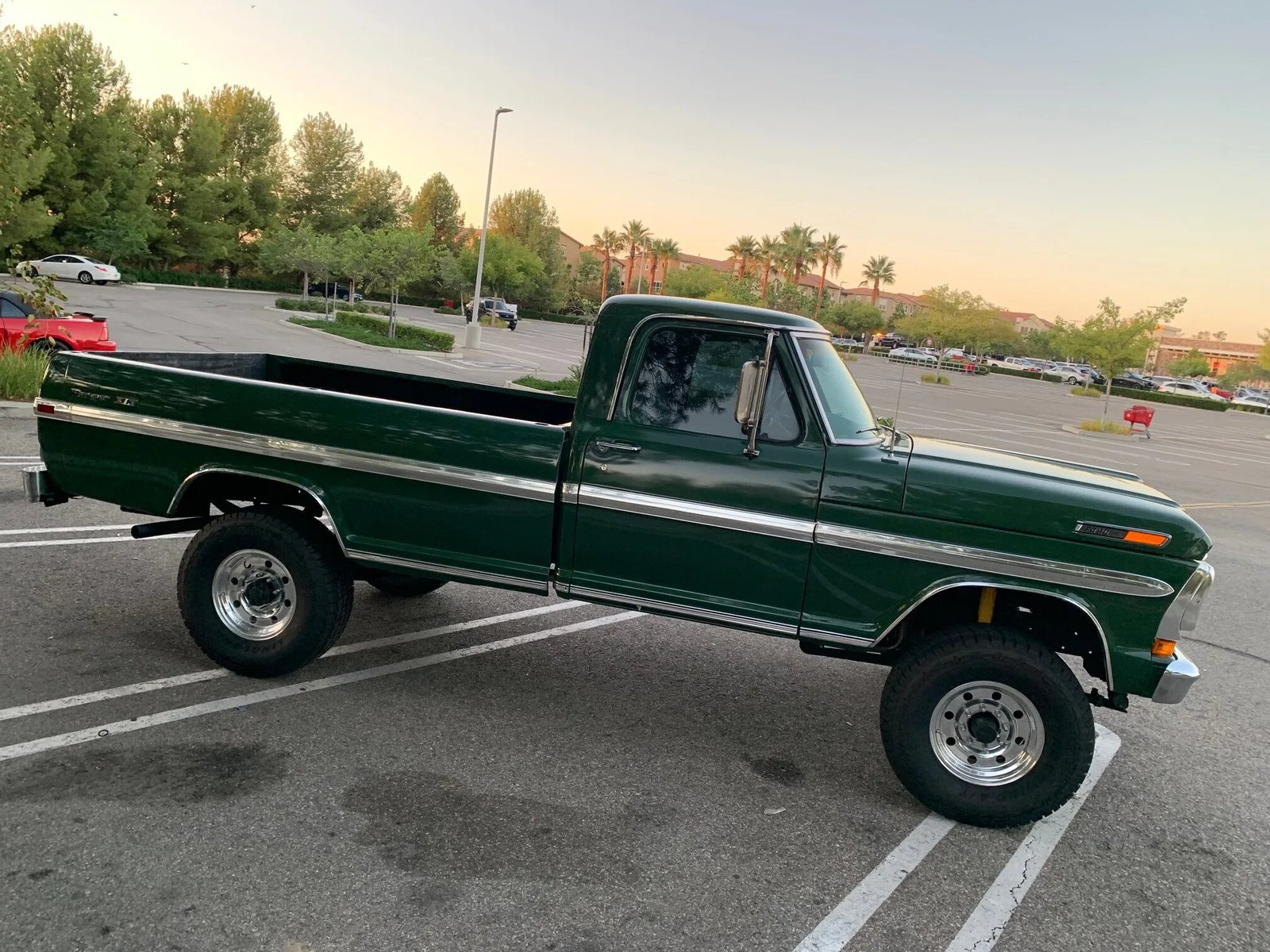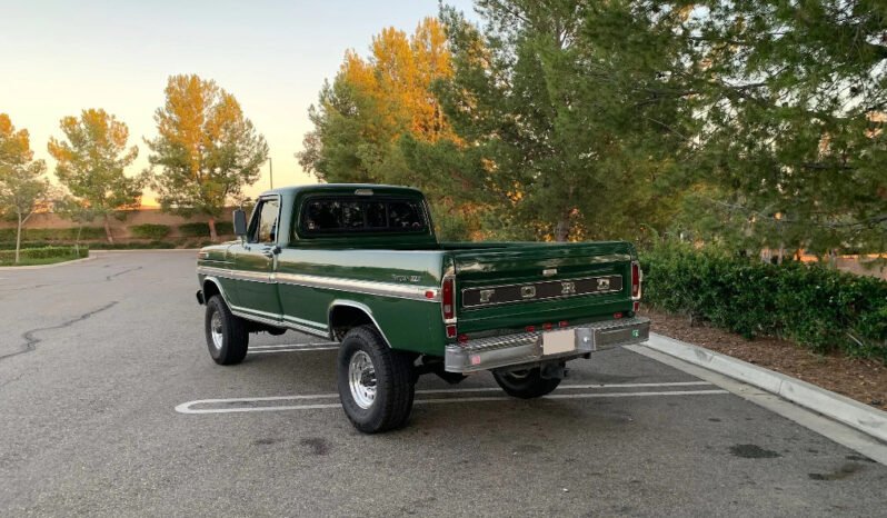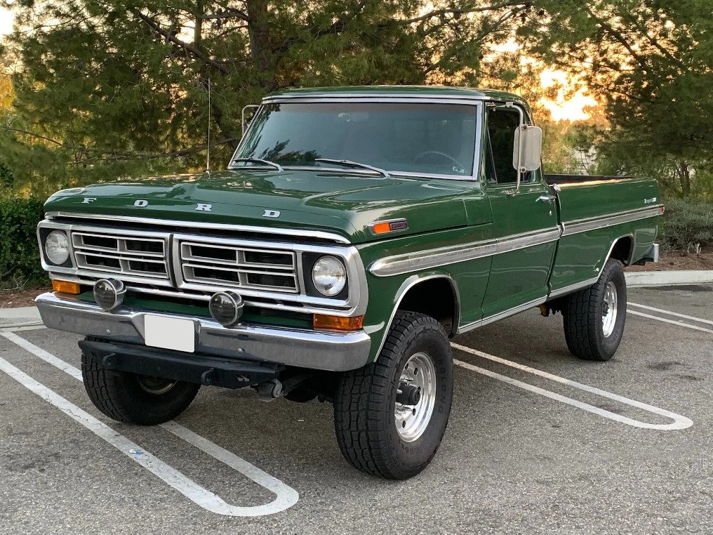 This 1972 Ford F-250 Ranger XLT, underwent a cosmetic and mechanical refurbishment that included installing a 428ci V8, repainting the truck in green, and replacing front suspension and interior components. Additional equipment includes a four-speed manual transmission, a dual-range transfer case, Edelbrock engine components, tubular exhaust headers, 16″ aluminum wheels, a Dana 50 twin traction-beam front axle, a Warn bumper extension, a receiver hitch, and air conditioning. Work in preparation for sale have included replacing the valve covers, shocks, and tires.