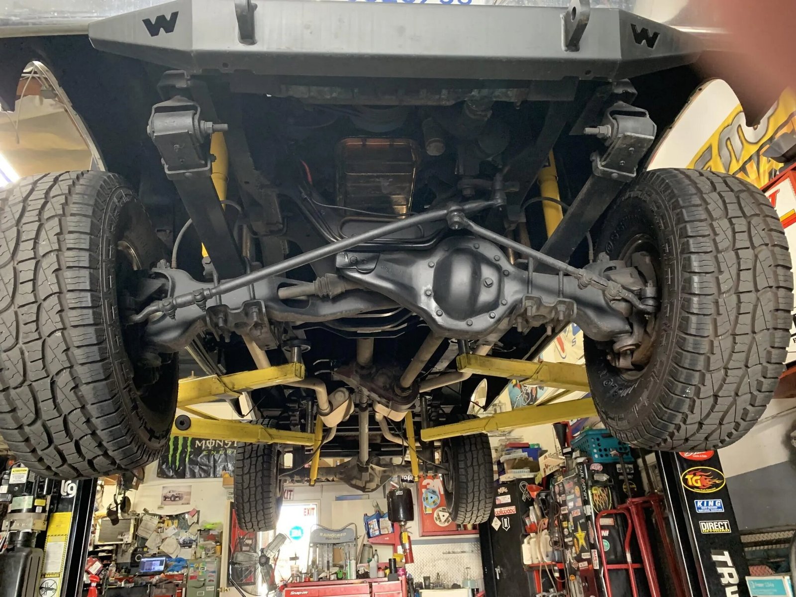 Polished 16″ aluminum wheels are mounted with 305/70 Linglong Crosswind tires. The truck is equipped with a Dana 50 twin traction-beam front axle that was sourced from a 1990 F-250. Stopping power is provided by front disc and rear drum brakes, and the truck is equipped with power steering. The shock absorbers and tires have been replaced.