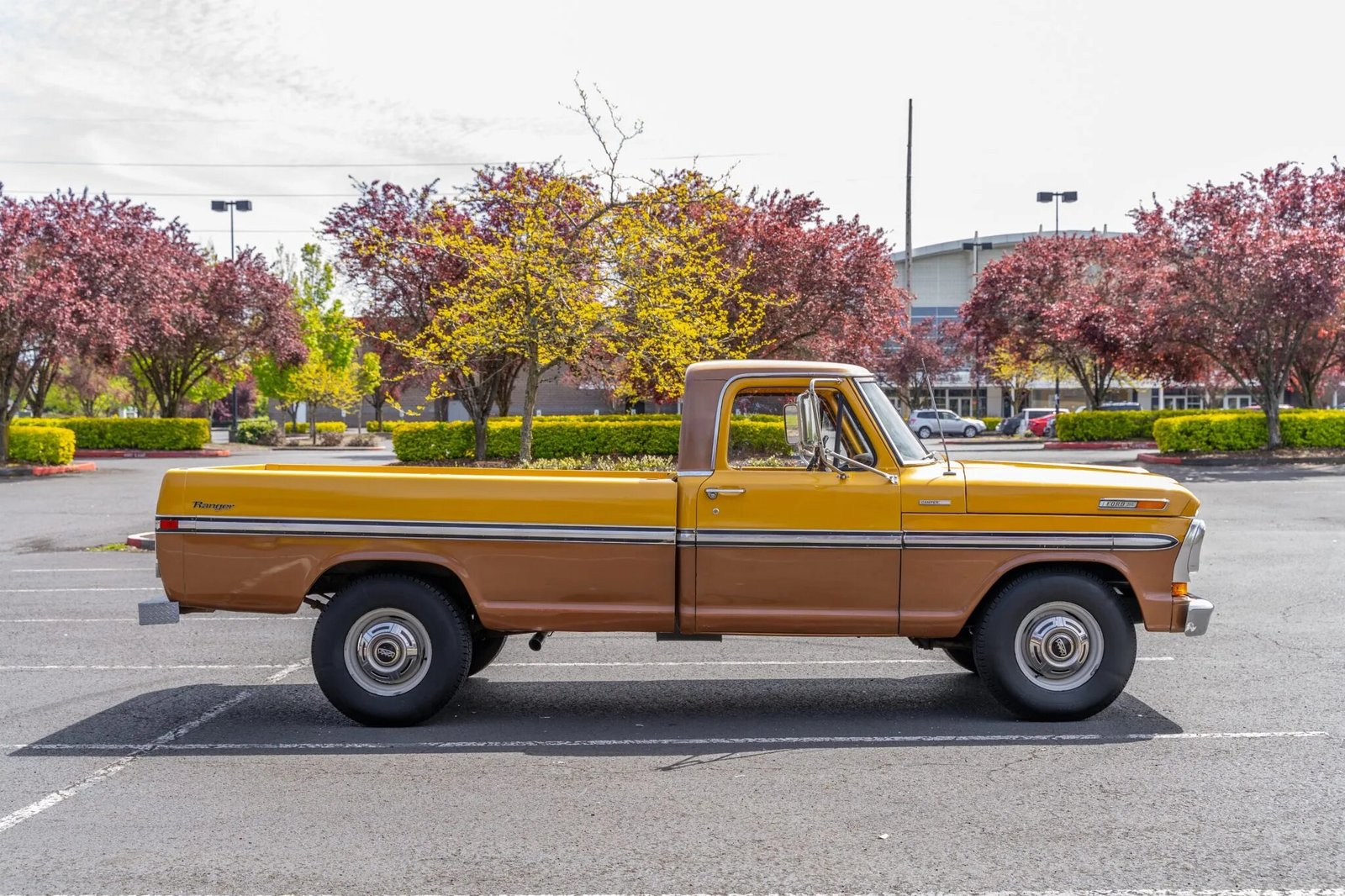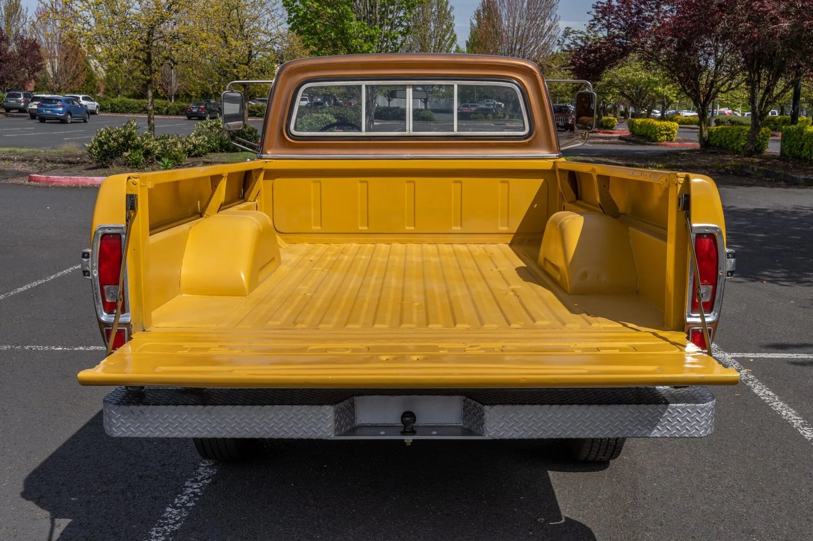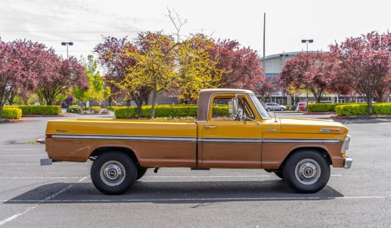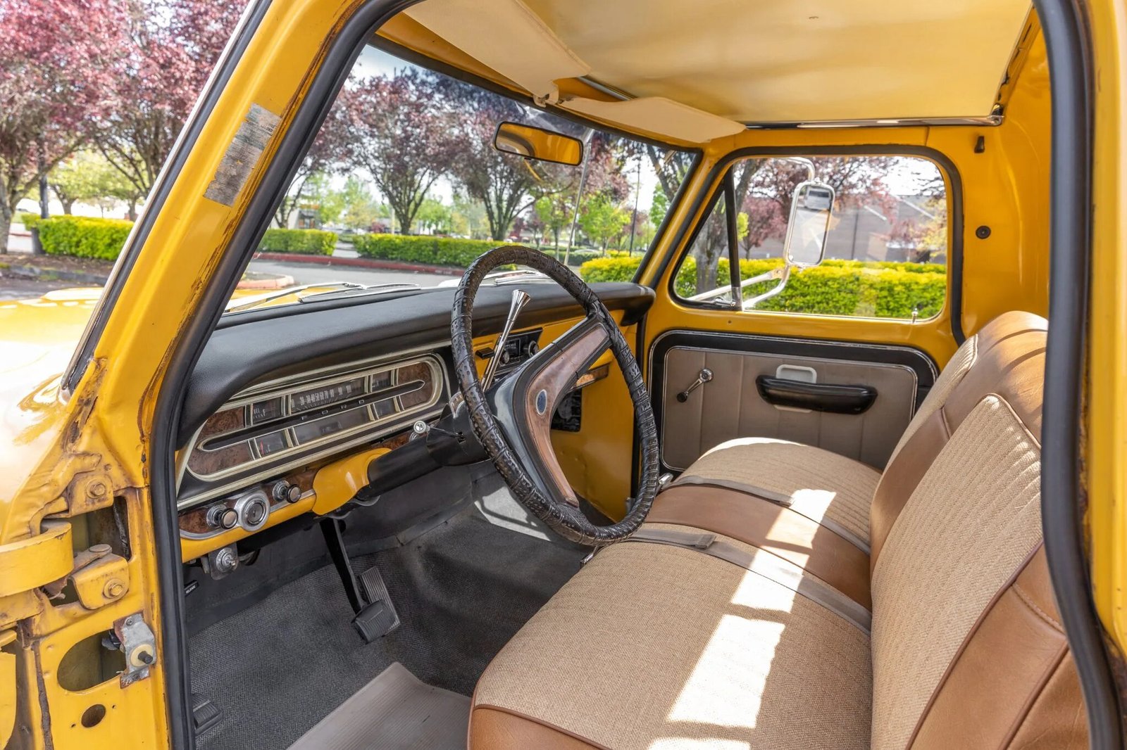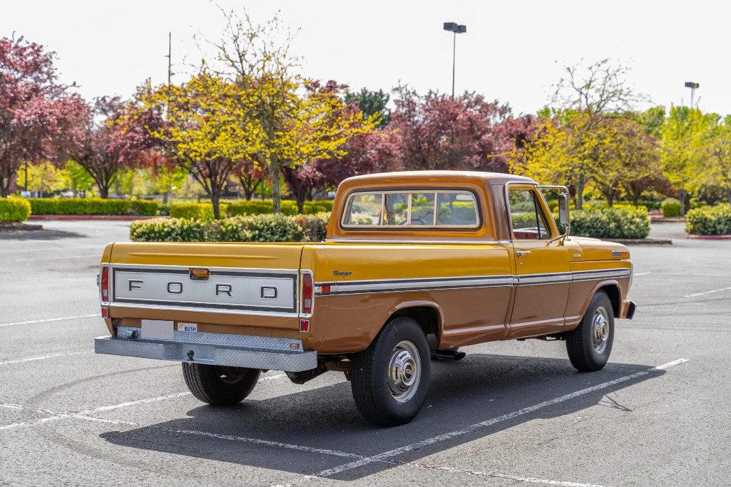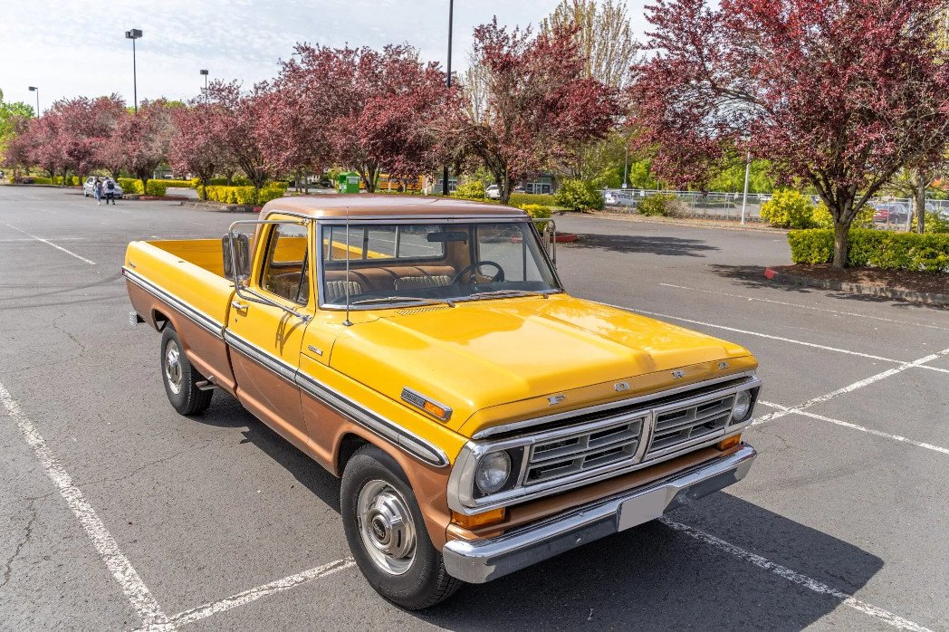 The truck is finished in two-tone yellow and brown, and it is powered by a 390ci V8 paired with a three-speed C6 automatic transmission.