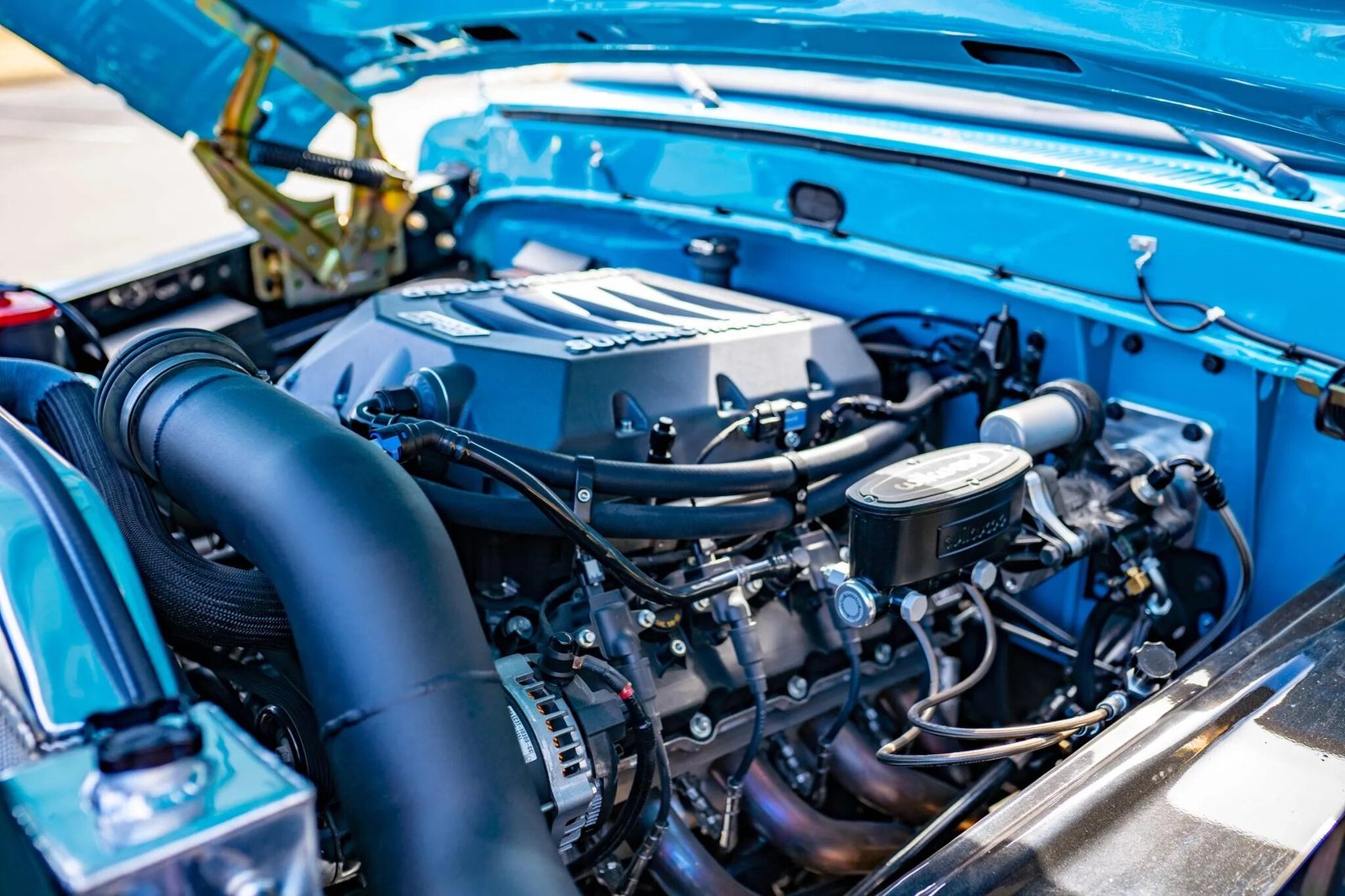 The replacement Ford 7.3-liter Godzilla V8 was installed by Gateway Broncos and features a Harrop USA TVS2650 supercharger with an integrated intercooler system as well as a Fueltech FT550 ECU and tubular headers.