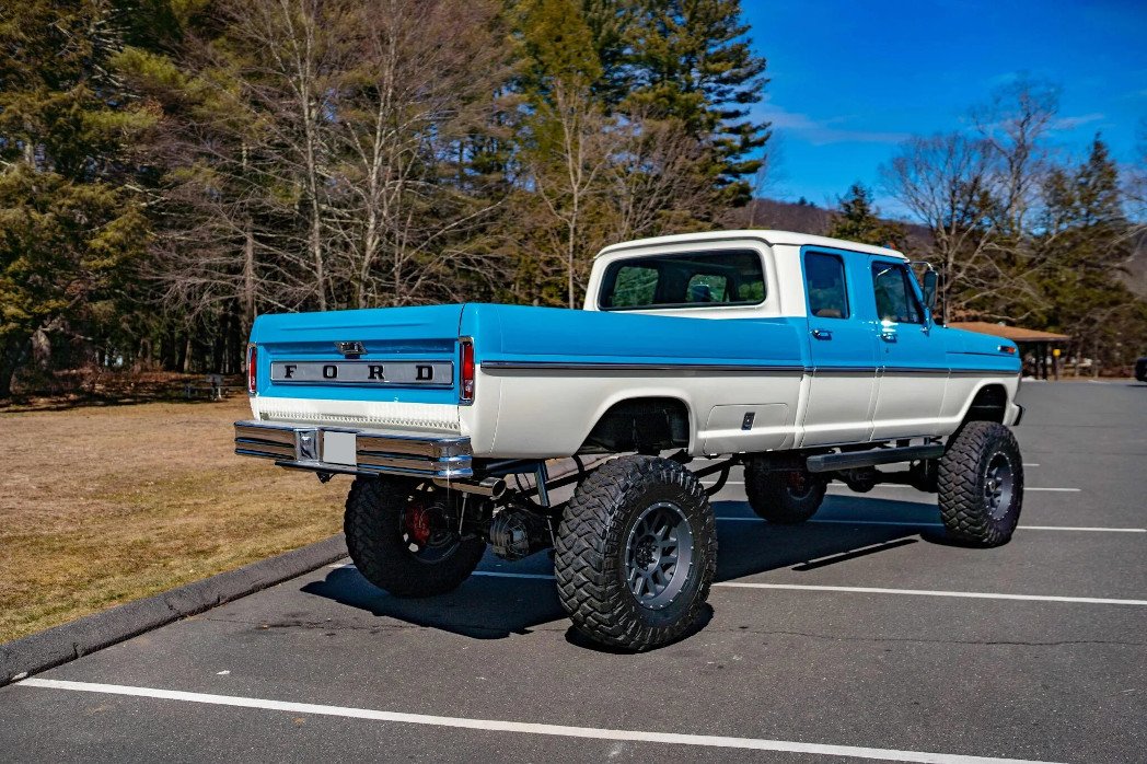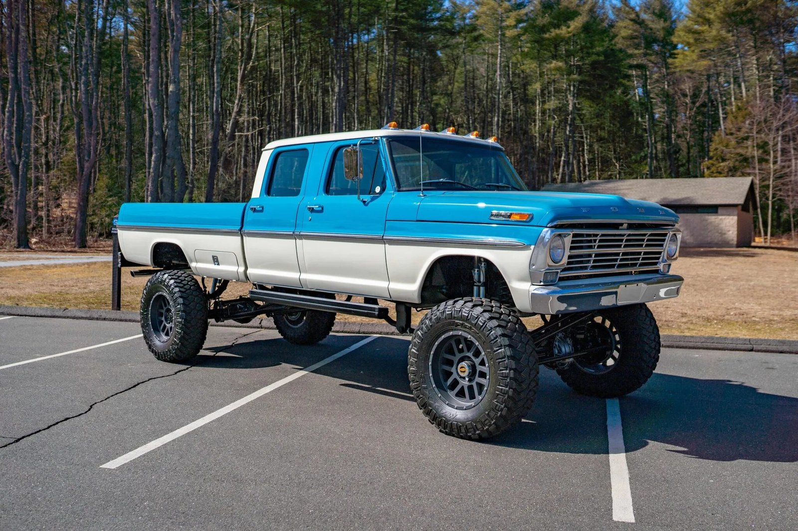 This 1972 Ford F-350 crew cab was modified with work consisting of refinishing the body and chassis and installing a Harrop-supercharged Ford 7.3-liter Godzilla V8 mated to a six-speed automatic transmission and a dual-range transfer case. Blue and Wimbledon White over brown distressed quilted leather upholstery. Additional features include Eaton ELocker front and rear differentials, Dana axles, a 1967-style grille, a wood bed floor, power side steps, Hydroboost power brake assist, Wilwood four-wheel disc brakes, a suspension lift, Bilstein shock absorbers, a four-link rear suspension system, and 20″ Method wheels as well as a Fueltech FT550 ECU, Shelby-style wood steering wheel, Dakota digital instrumentation, and a retro-style digital stereo.