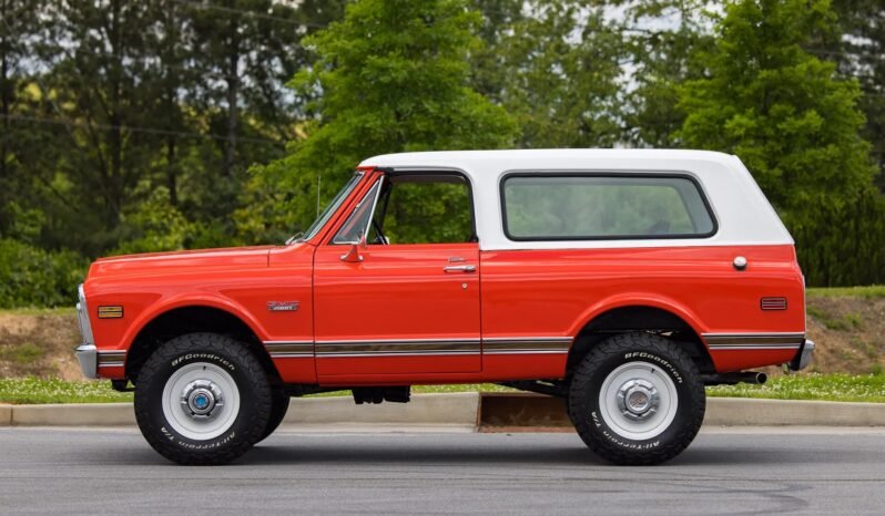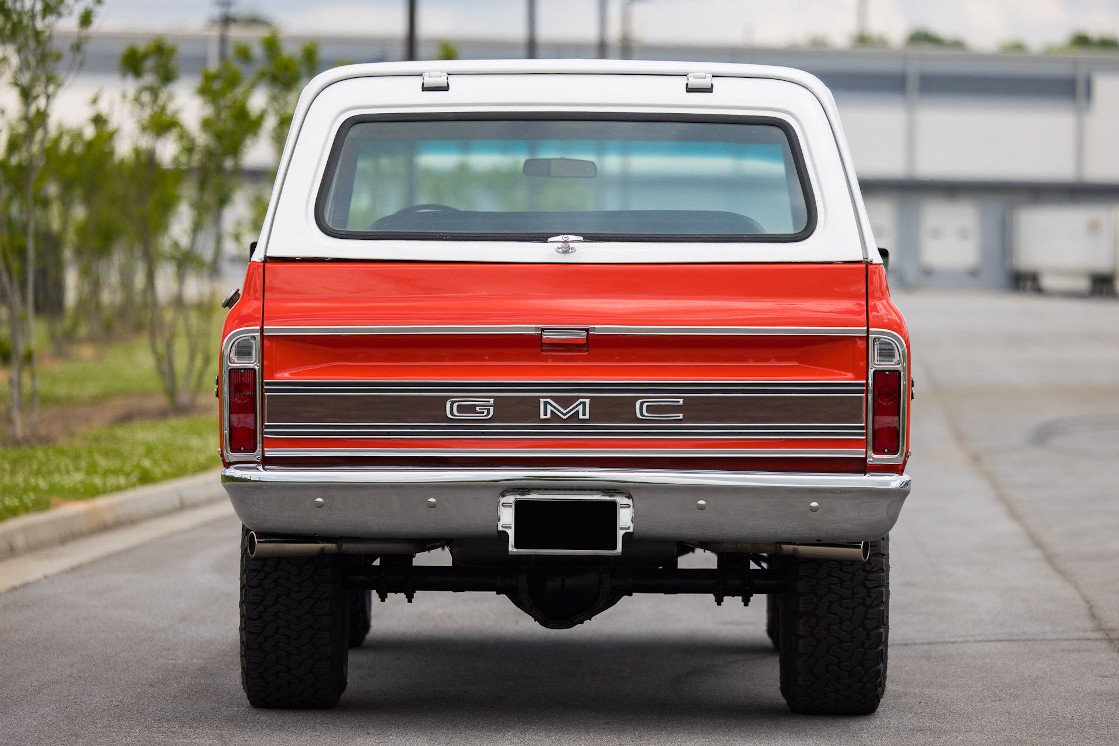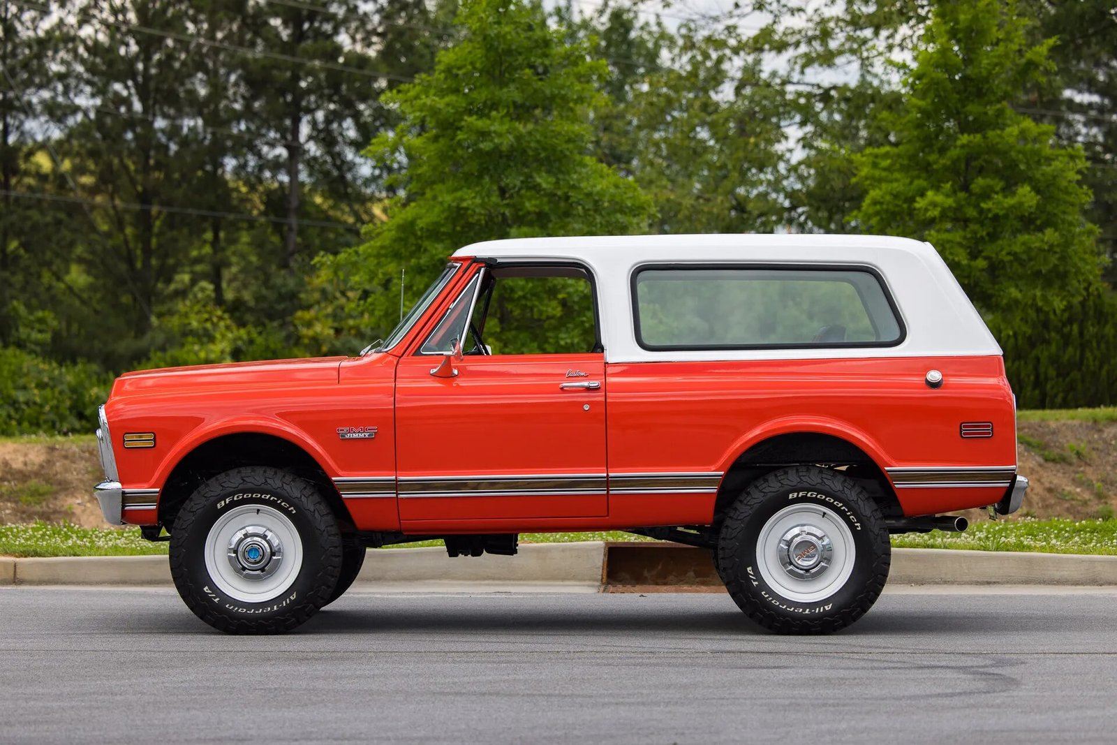 This 1972 GMC Jimmy Cheyenne is finished in orange over black and orange houndstooth upholstery and powered by a replacement 350ci V8 mated to a three-speed automatic transmission, dual-range transfer case, and limited-slip rear differential. Equipment includes a removable white hardtop, 17″ steel wheels, quadruple headlights, and lap belts.