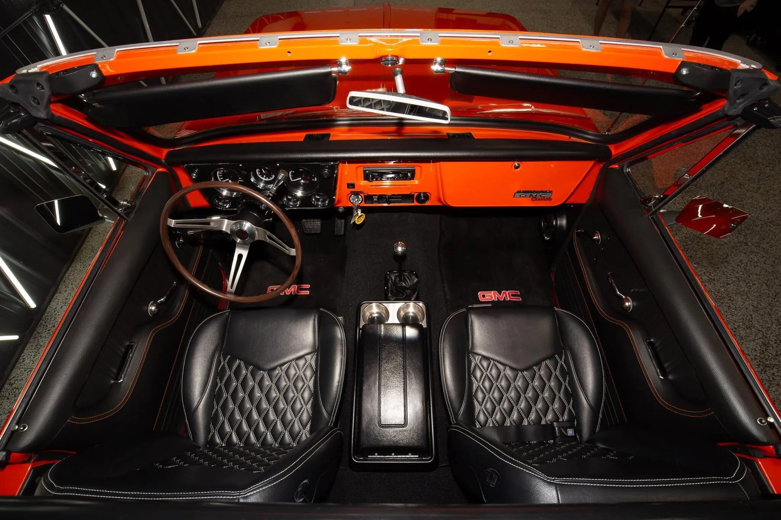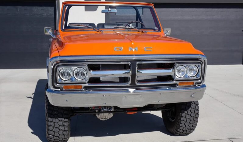 This 1972 GMC Jimmy was refurbished and is powered by a 6.0-liter GM V8 that is fitted with a Magnuson supercharger and is mated with a four-speed automatic transmission and a dual-range transfer case. The truck has been refinished in orange and white over black leather and is equipped with a Dana 44 front axle, an Auburn limited-slip rear differential, Fox shocks, LED headlights, 15″ Rally wheels, power-assisted front disc brakes, Dakota Digital instrumentation, and a Pioneer Bluetooth stereo.