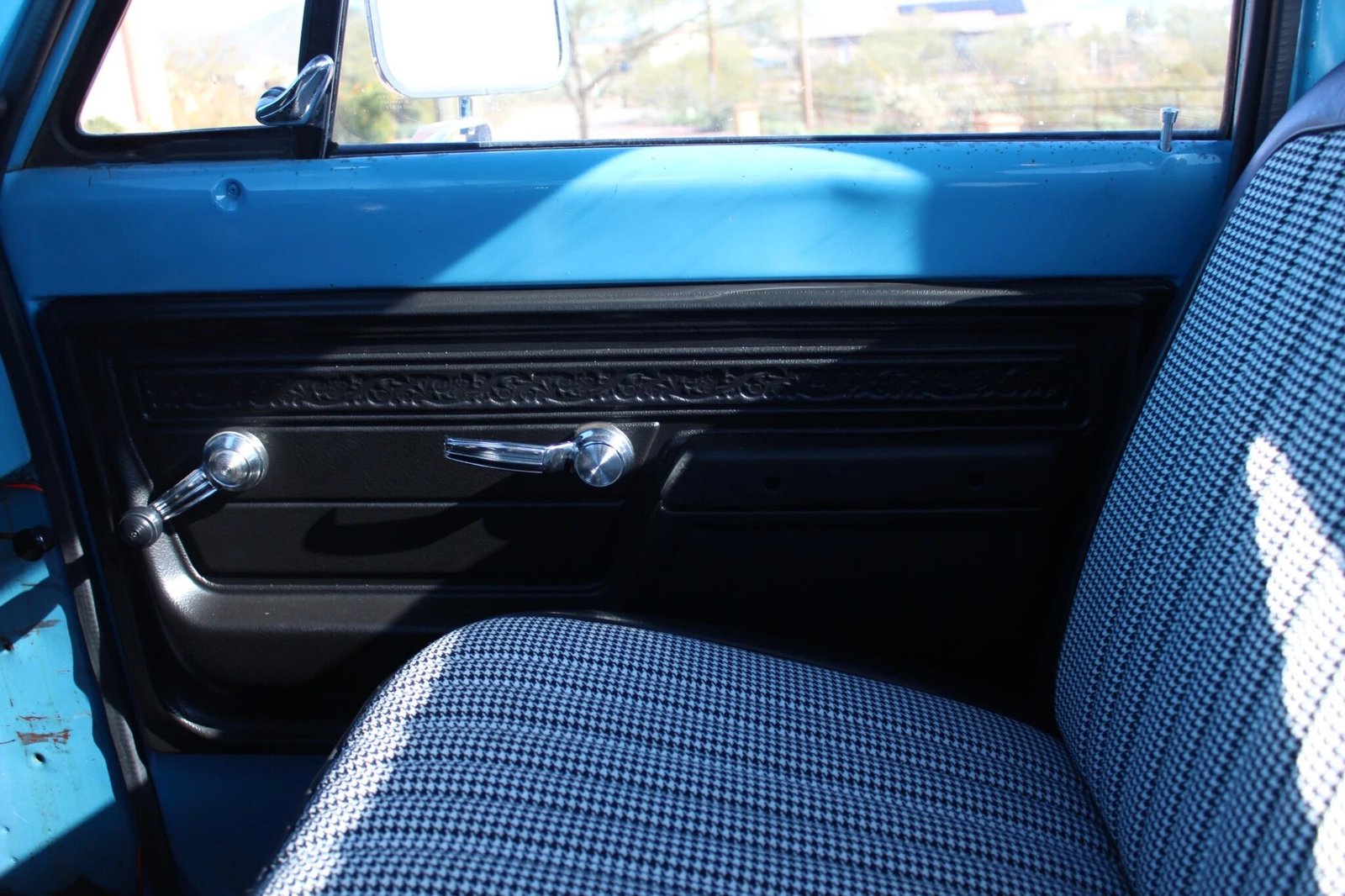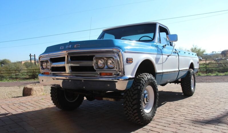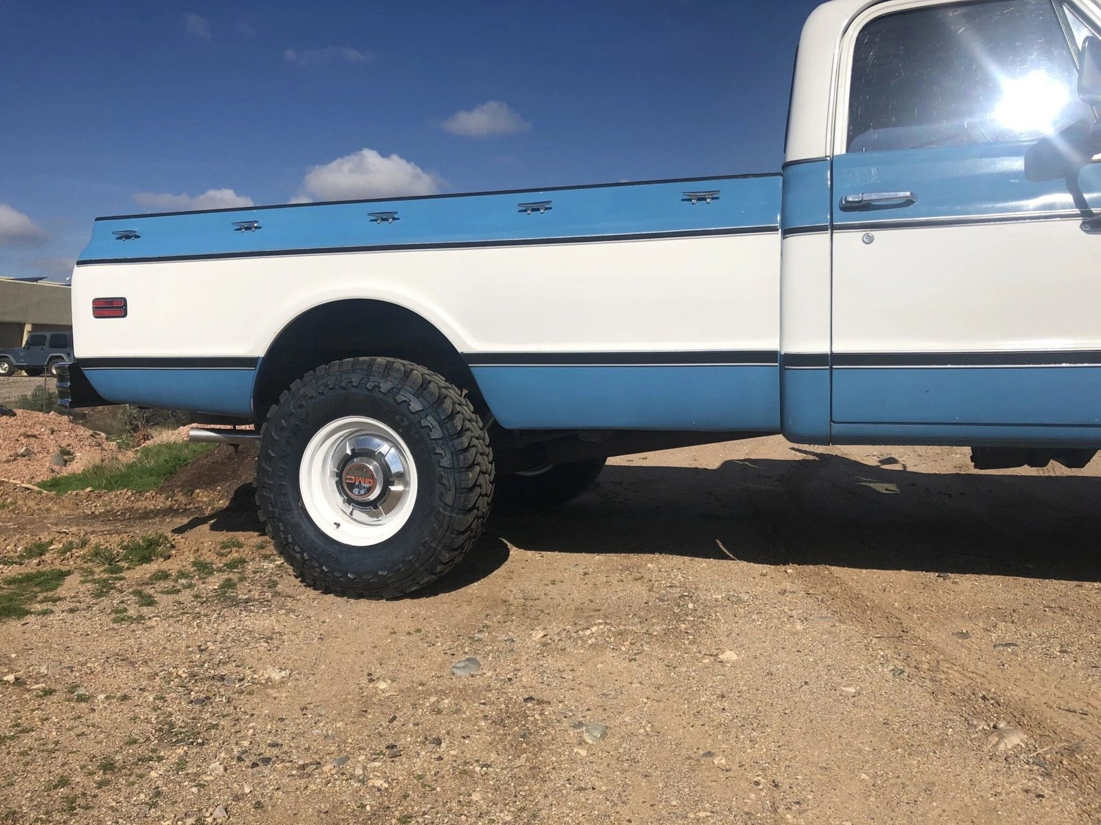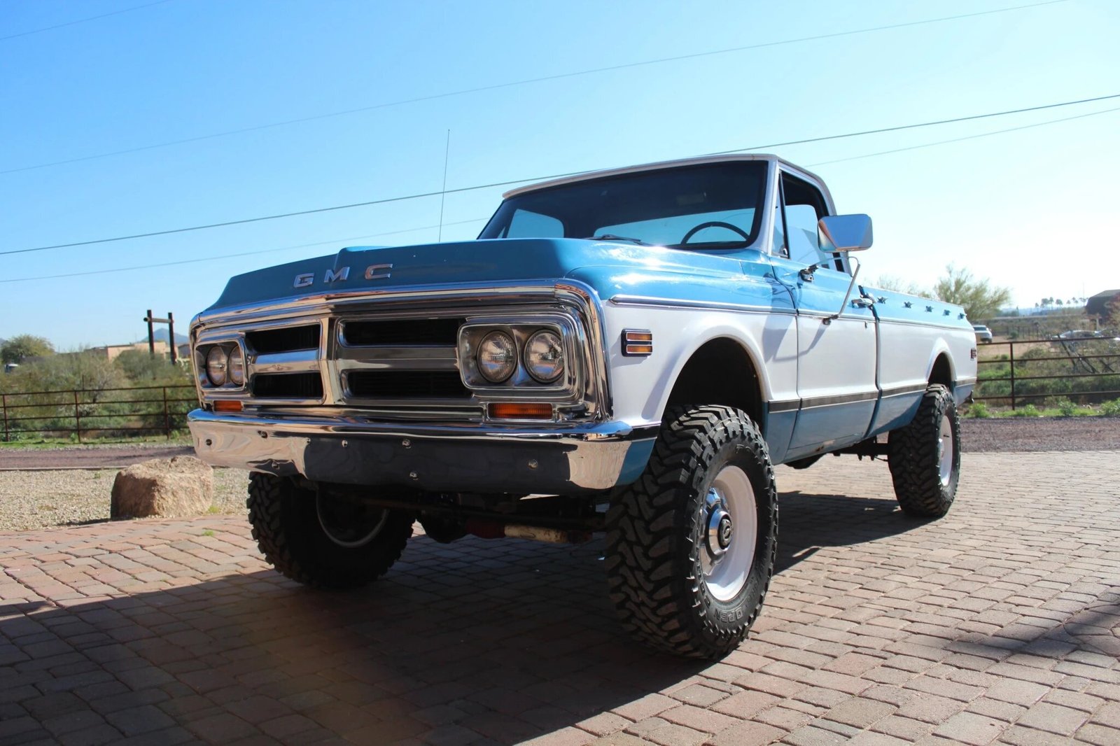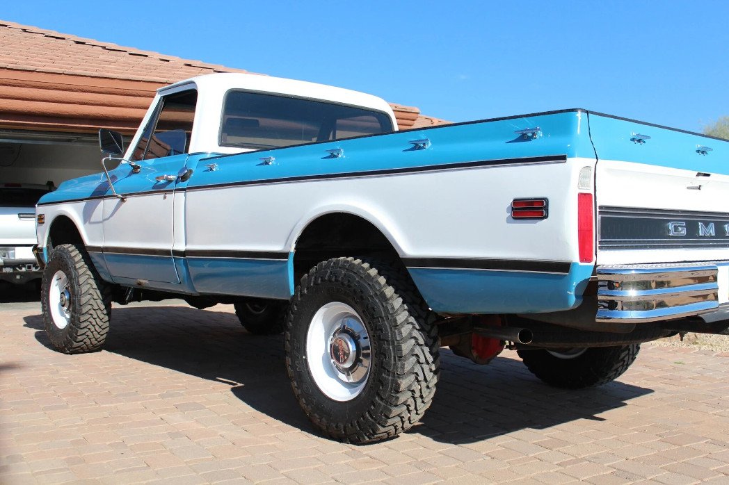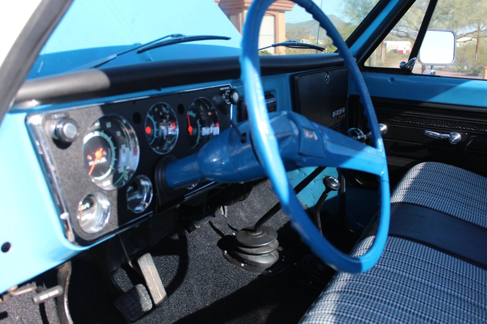 This 1972 GMC K2500 pickup is finished in Medium Blue and white over a replacement black vinyl and houndstooth interior.