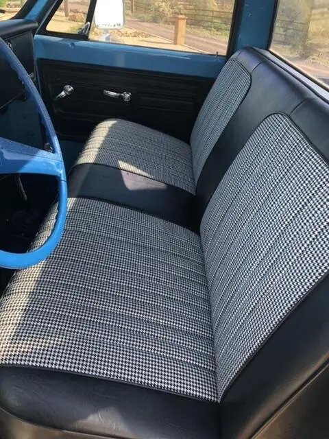 The replacement interior features a bench seat upholstered in black vinyl with houndstooth cloth inserts, black door panels, and black carpeting.
