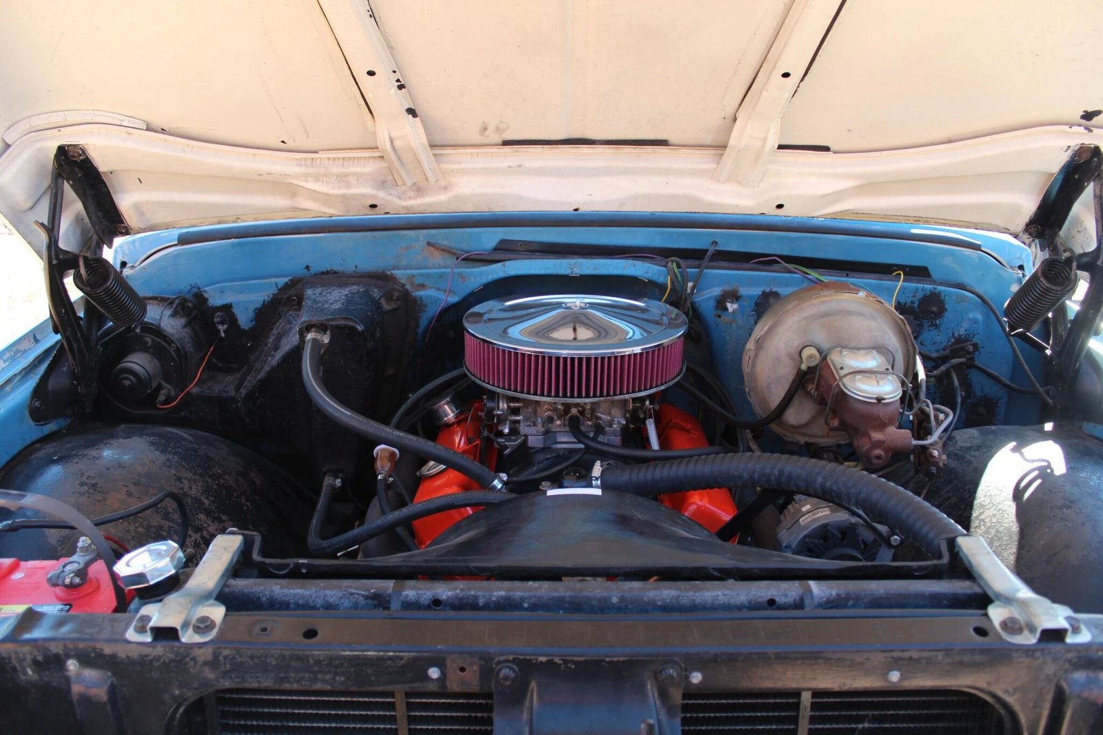 The 350ci V8 was rebuilt in October 2019 with a .030″ overbore of the cylinders and the installation of replacement pistons, piston ring gaskets, camshaft lifters, valves, valve seats, a water pump, drive belts, and engine seals.