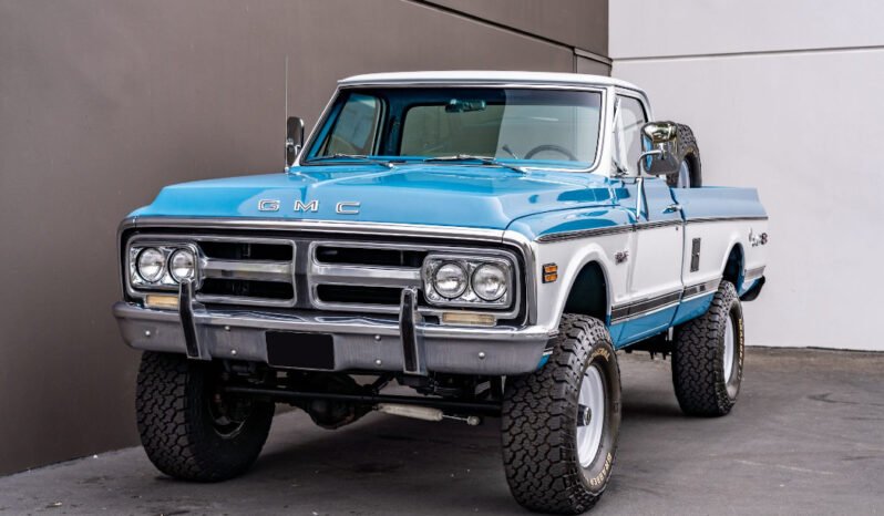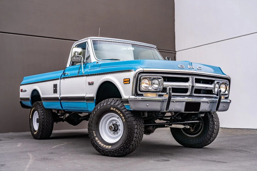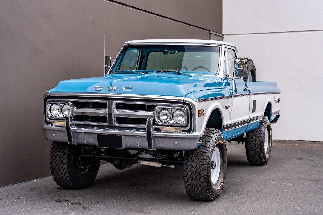 This 1972 GMC K2500 Sierra Grande is a standard cab fleetside 3/4-ton pickup powered by a 5.3-liter Vortec V8 paired with a four-speed automatic transmission and a dual-range transfer case and is finished in blue and white over a matching interior. The truck was subsequently refurbished with work consisting of repainting the body, retrimming the interior, relocating the fuel tank, and installing the engine, transmission, and a 4″ suspension lift. Additional equipment includes 16″ white steel wheels, front disc brakes, power steering, Warn manually-locking front hubs, a bed-mounted spare tire, a receiver hitch, and a vintage-look Custom Autosound stereo.