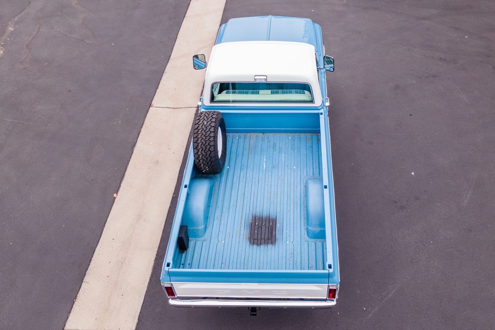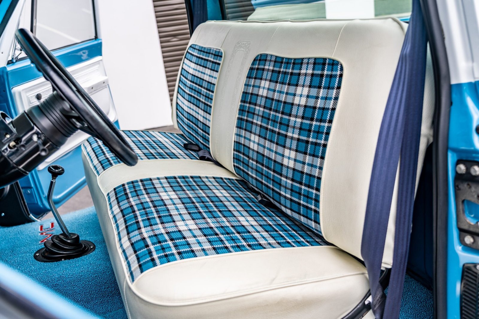 The standard cab features bench seating reupholstered in white vinyl with plaid blue cloth inserts joined by a blue-painted dashboard, blue carpets, and white door panels.