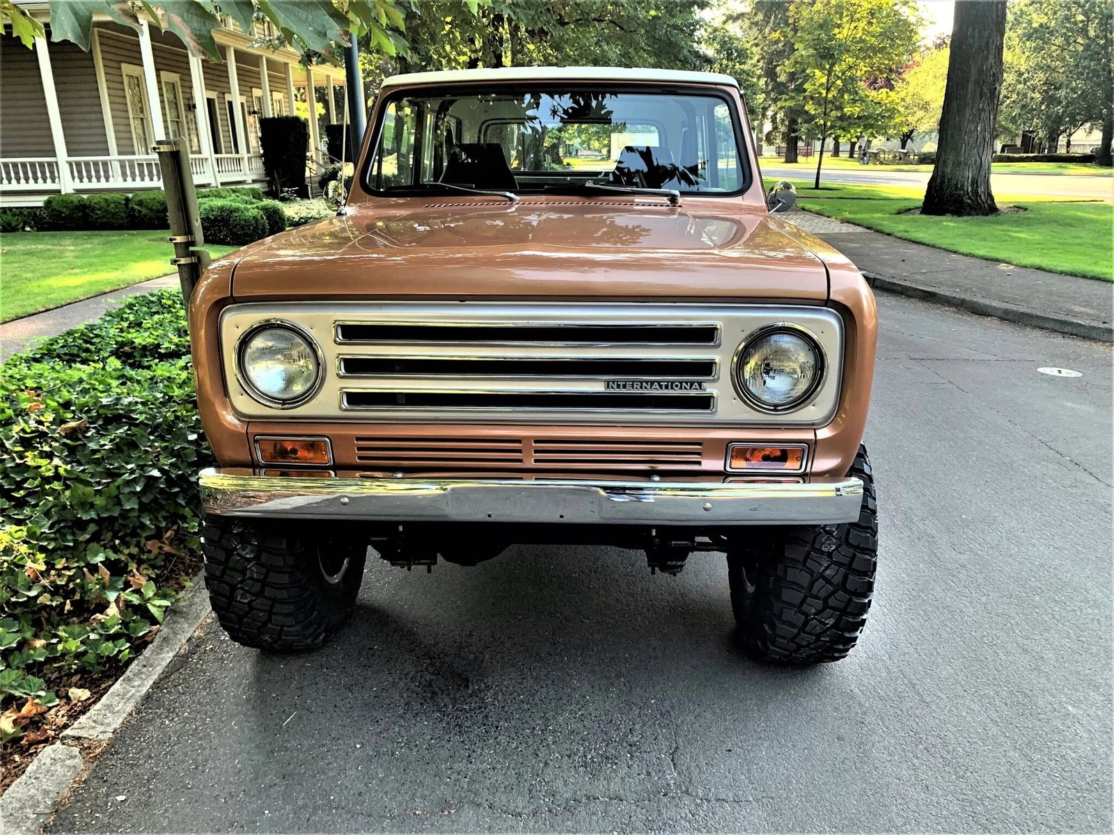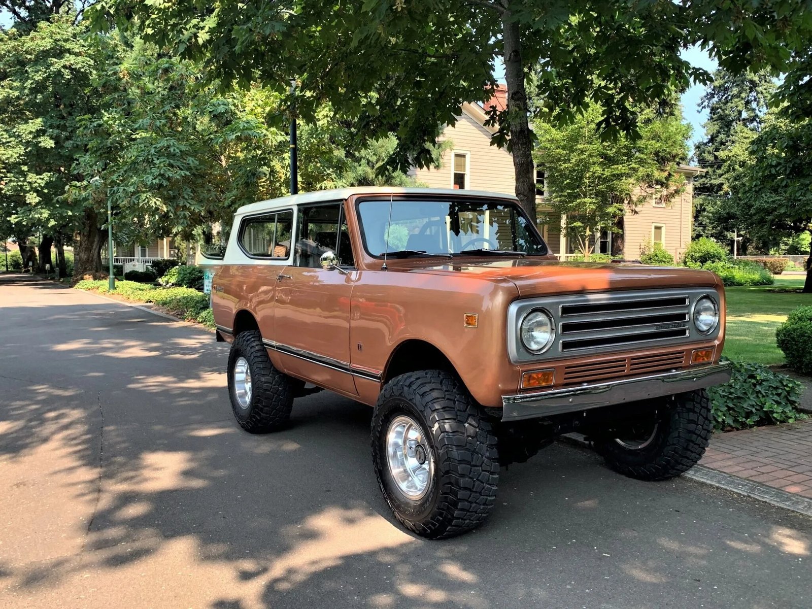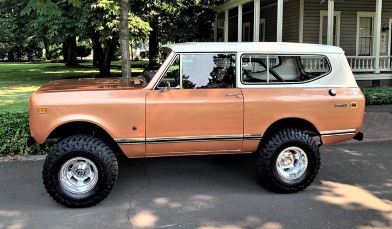 This 1972 International Harvester Scout II is finished in Rose Gold over black cloth and is powered by a 345ci V8 mated to a three-speed automatic transmission and a two-speed transfer case.