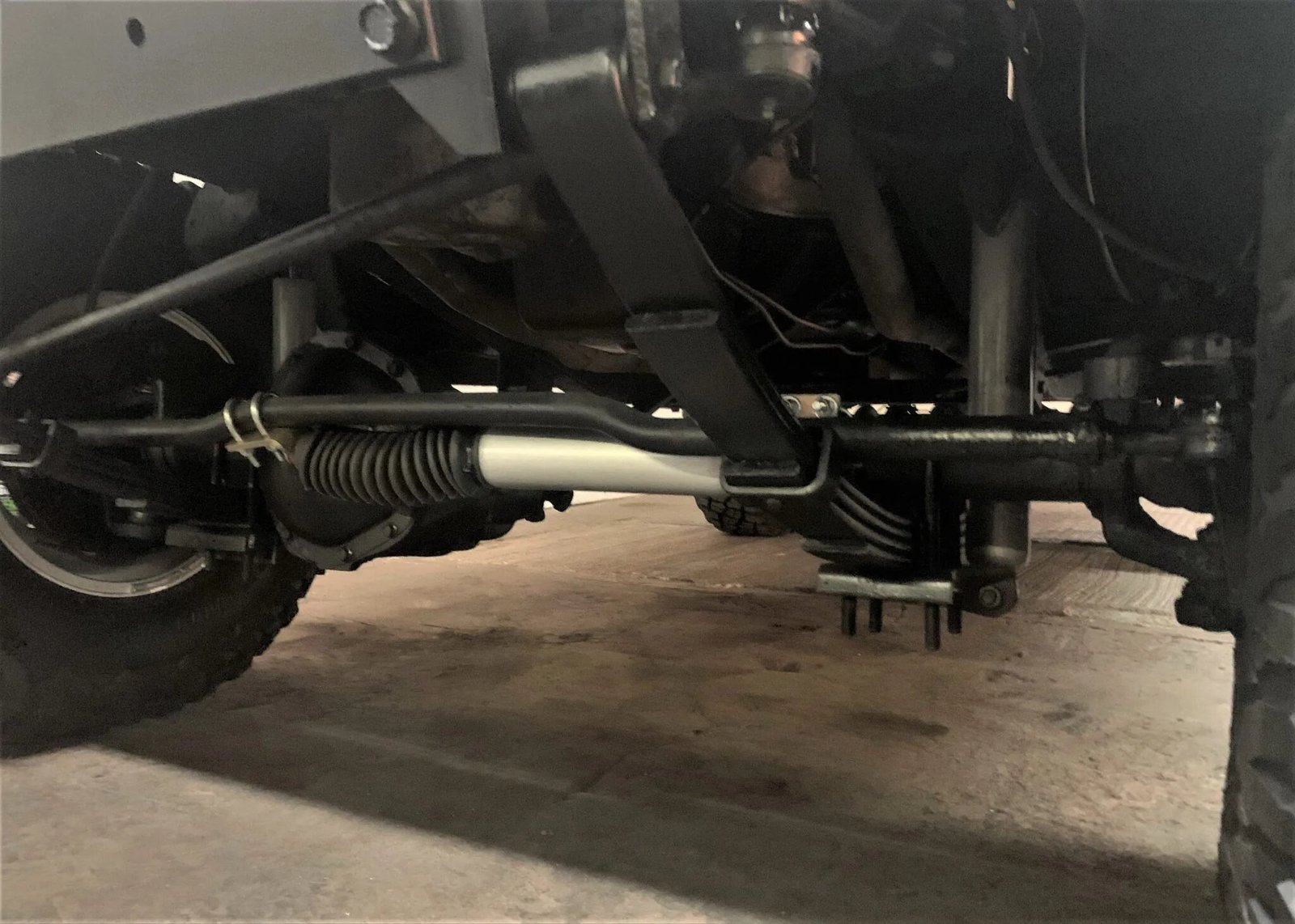 The ride height have been raised approximately 4″ using replacement shocks, springs, and a steering damper.