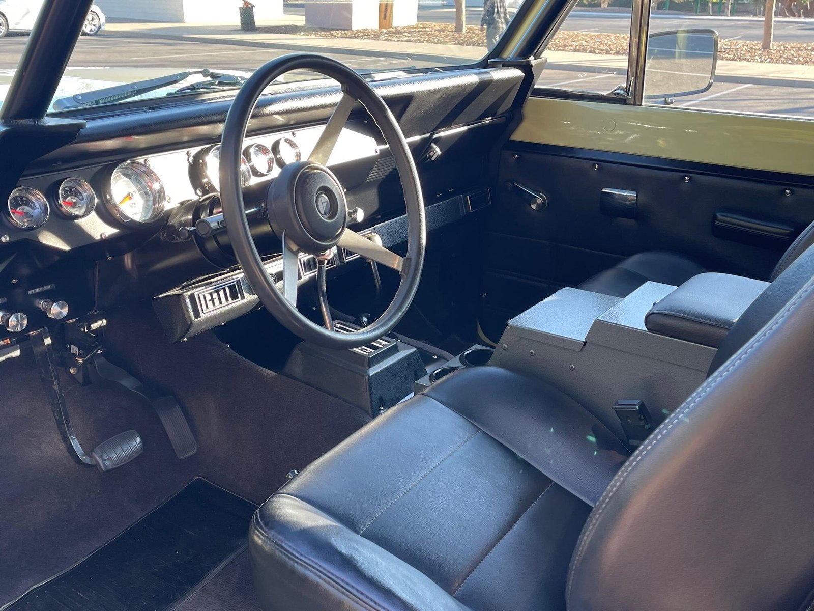 A three-spoke steering wheel is mounted on a tilting column and frames Autometer instrumentation including an electric 160-mph speedometer, a tachometer, and auxiliary gauges.