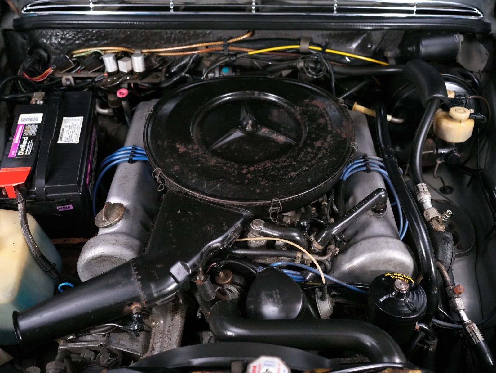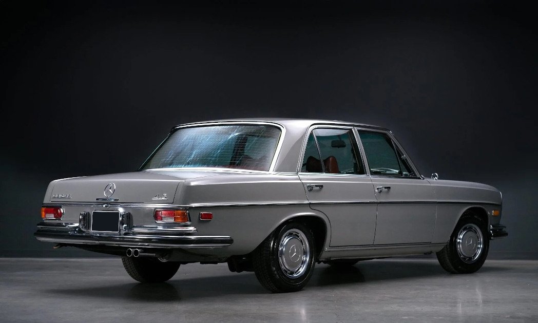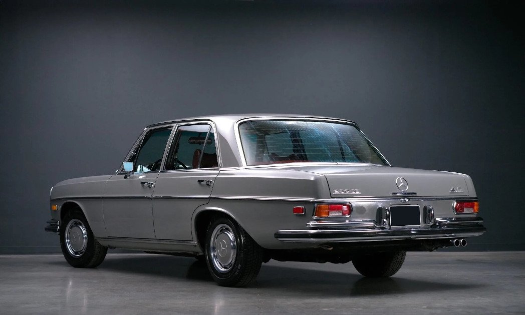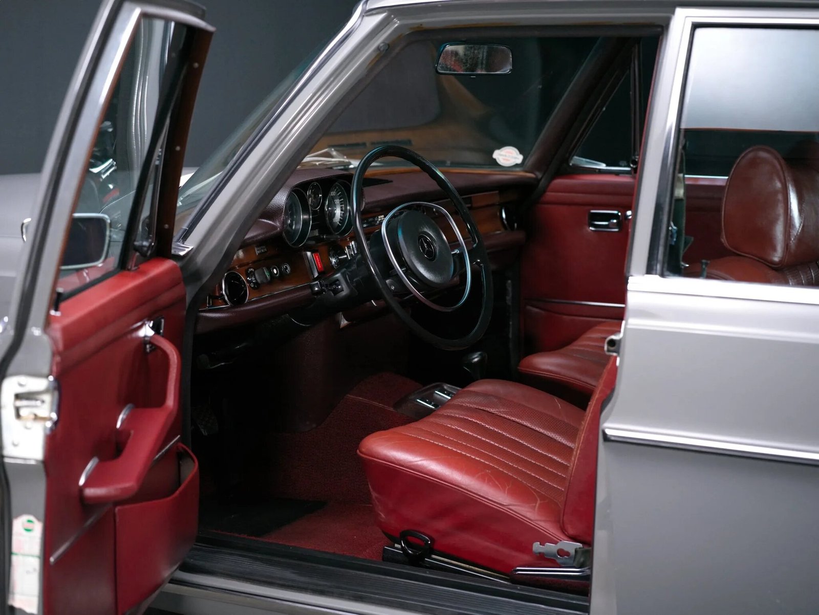This 1972 Mercedes-Benz 280SE 4.5 is finished in Arabian Gray over red leather and is powered by a 4.5-liter V8 paired with a three-speed automatic transmission.