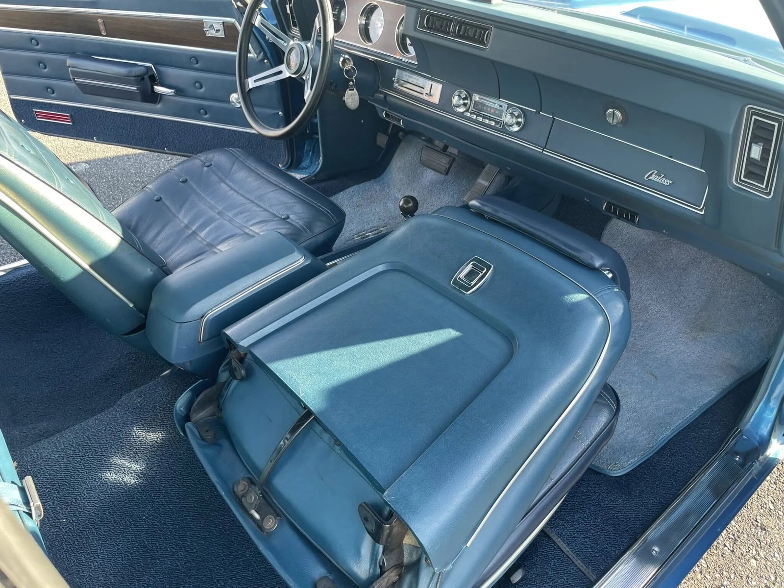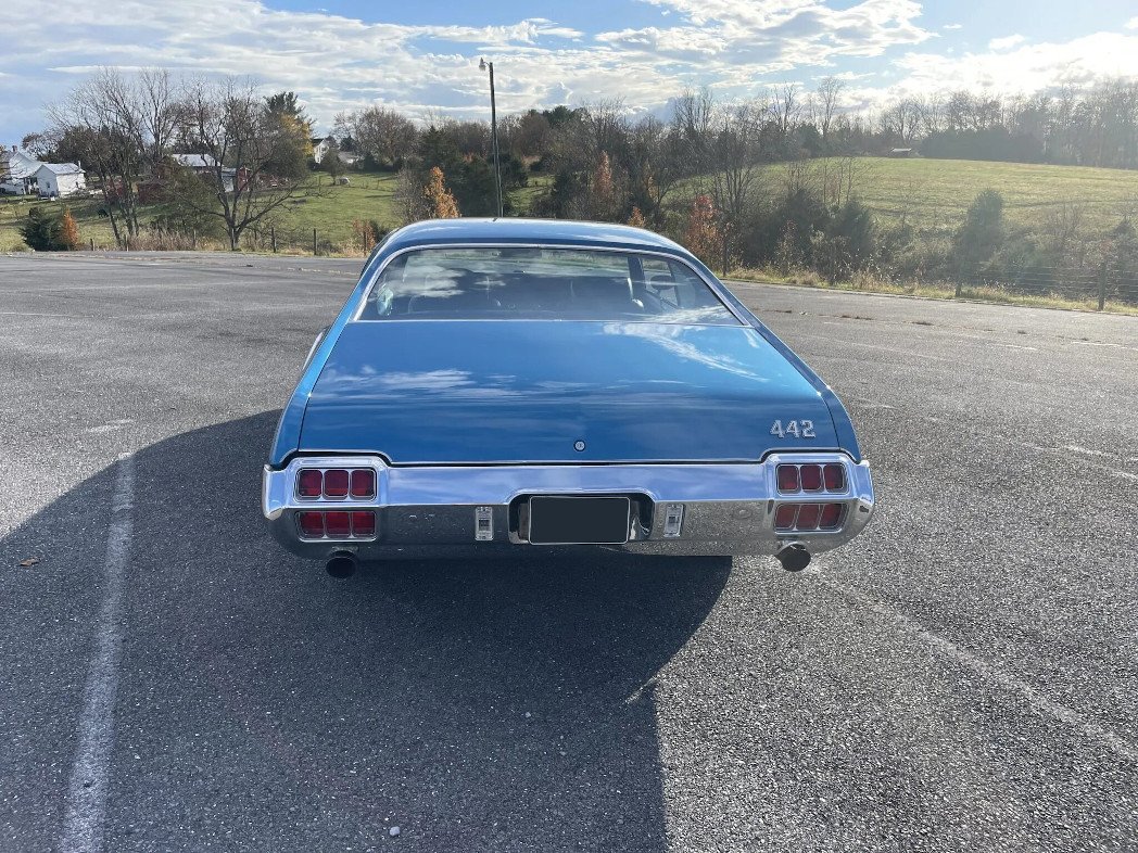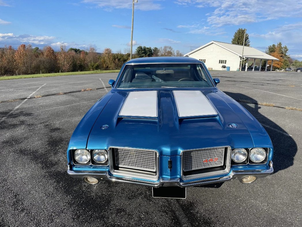 The body was refinished in its factory shade of Viking Blue (26) in 2021, the front fenders were patched and the rear quarter panels were replaced in addition to the roof rails, weather seals, grilles, and badging. Features include a replacement chrome rear bumper, dual exhaust outlets, and 442 badging in addition to a ram-air hood with white stripes and chrome twist locks.