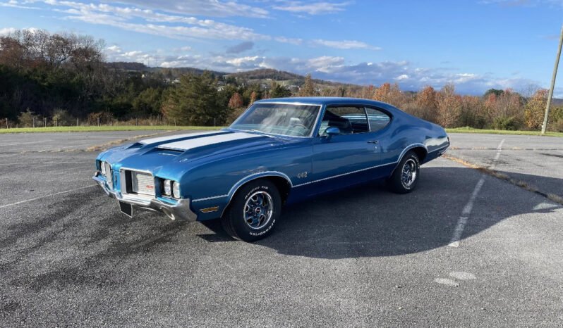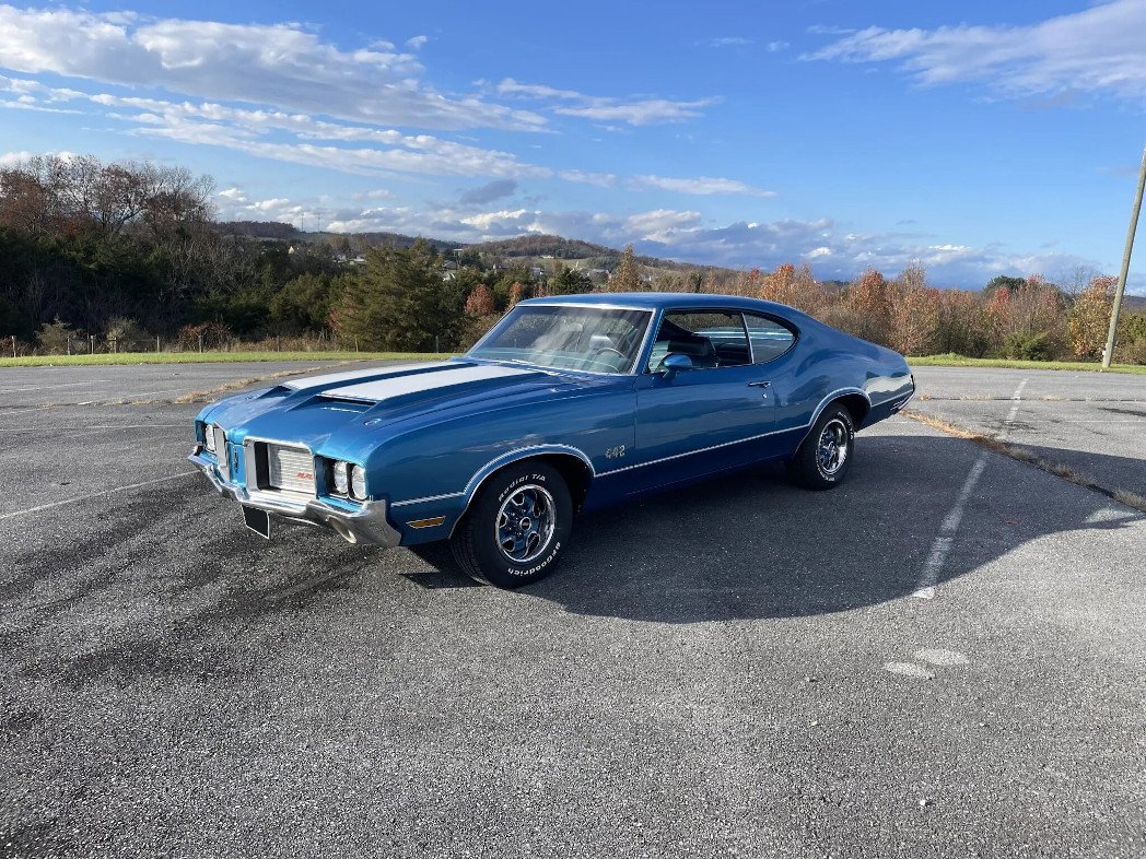 This 1972 Oldsmobile 442 hardtop coupe is finished in Viking Blue over a color-coordinated interior and is powered by a 350ci V8 paired with a three-speed automatic transmission. Produced at GM’s Lansing, Michigan, facility. Equipment includes dual hood scoops, 442 badging, power-assisted steering, front disc brakes, Strato-Bucket front seats, air conditioning, an AM/FM radio, and a center console. The brake and suspension systems were serviced, also included body repair, a repaint, fluid changes, servicing the fuel system, converting the air conditioning system to R134a refrigerant, and replacement of the radiator, battery, wheels and tires.