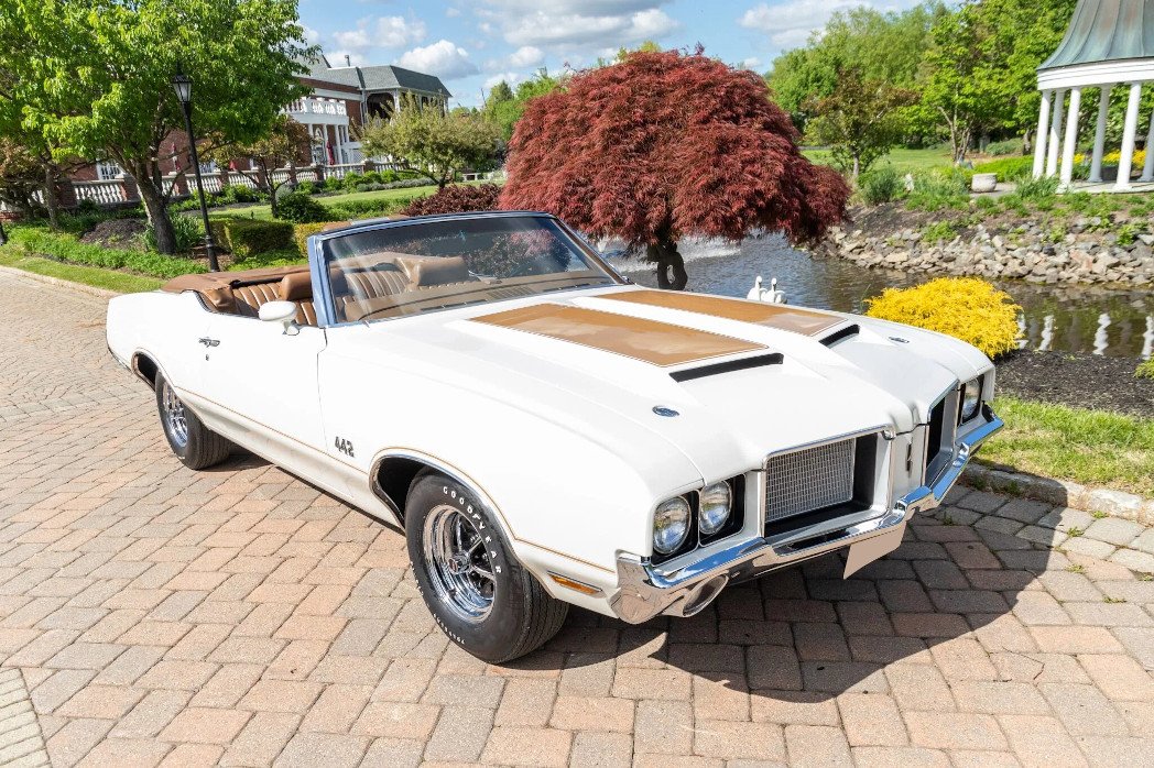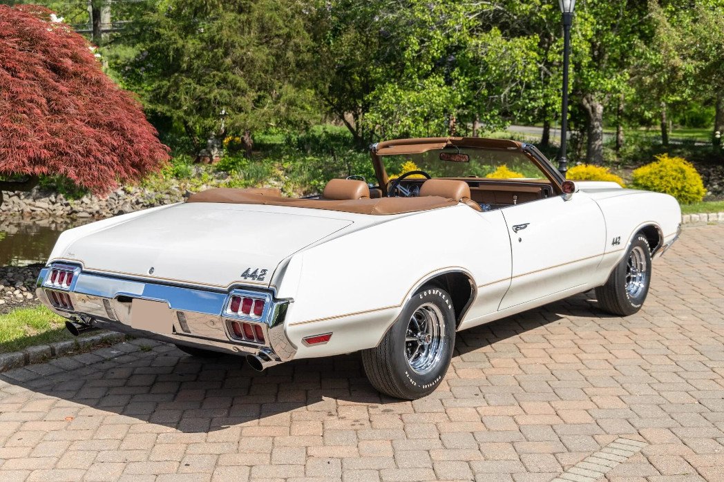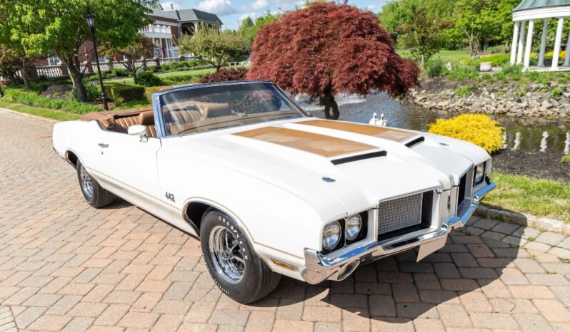 Features include a power-operated convertible top, a ram-air hood with chrome twist locks, a chrome rear bumper with dual exhaust outlets, 442 badging, and gold accent striping.