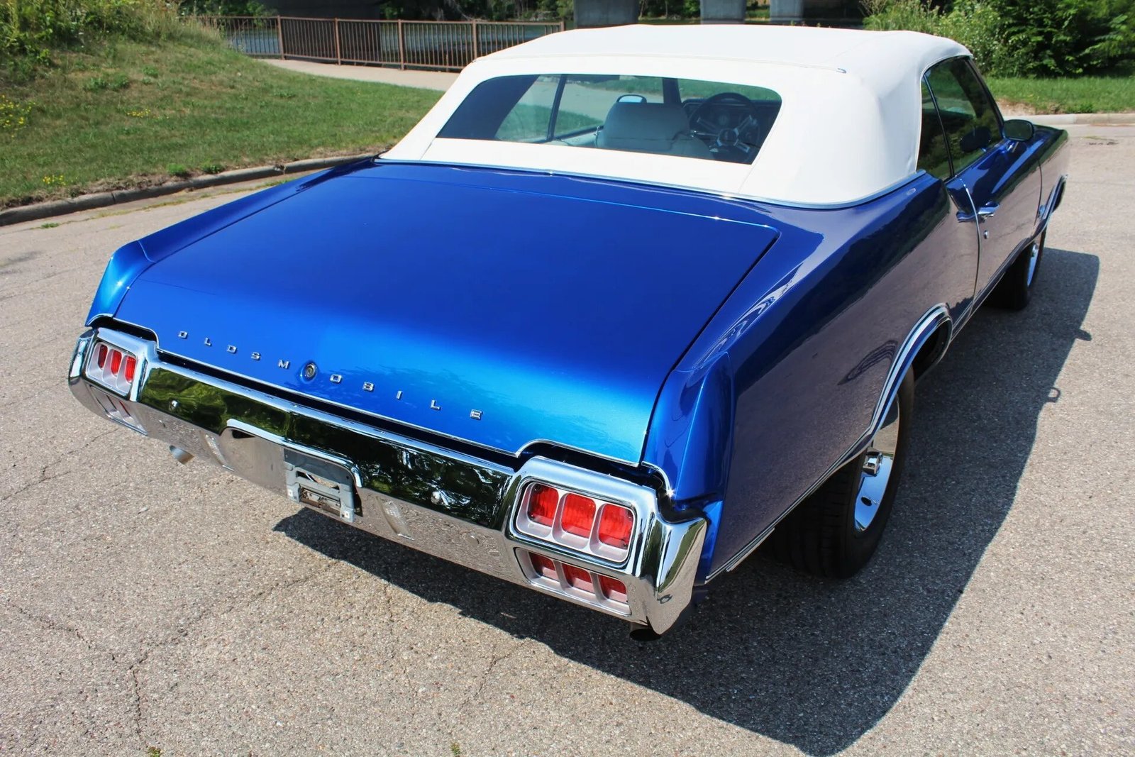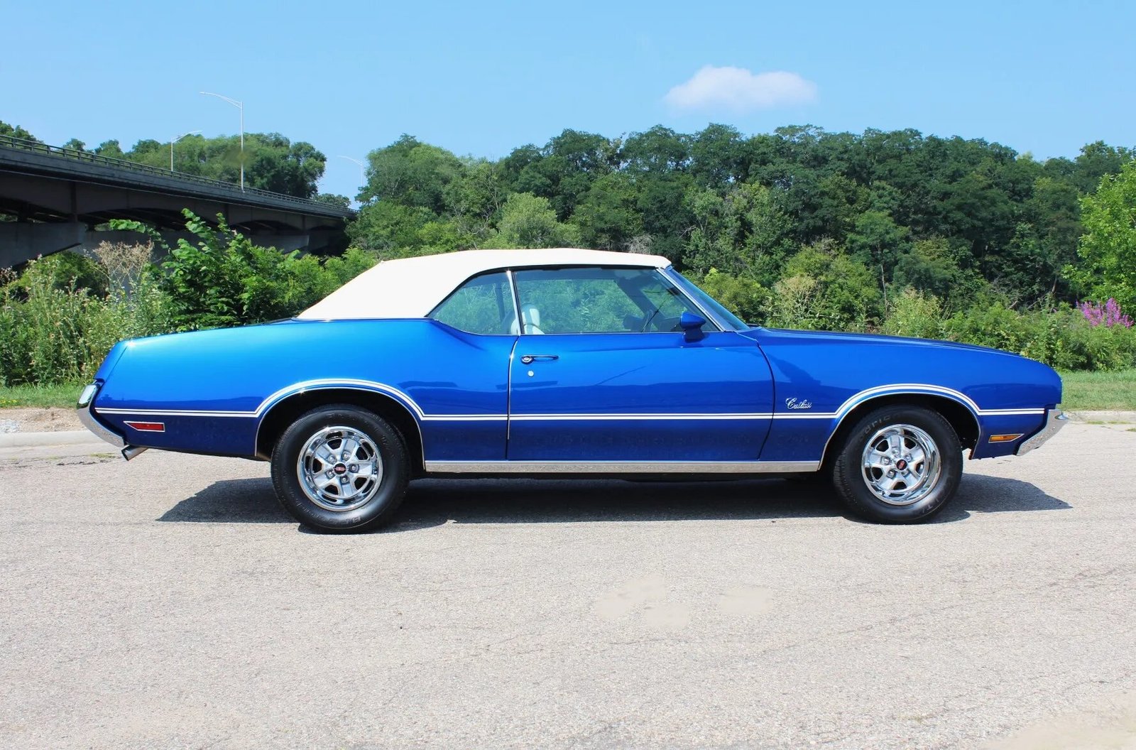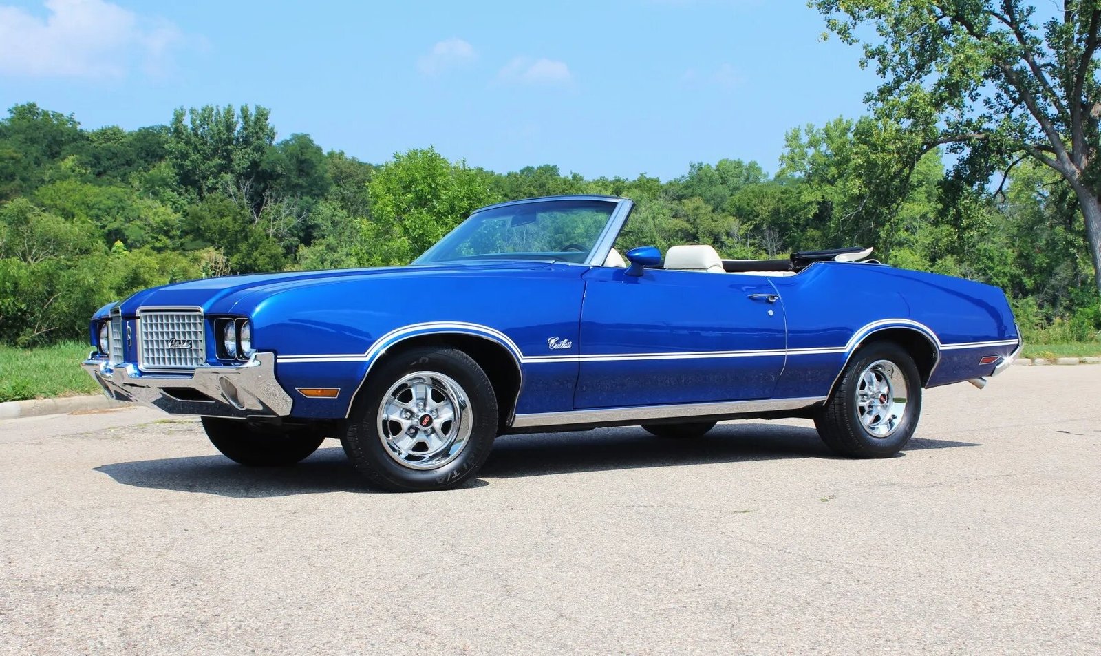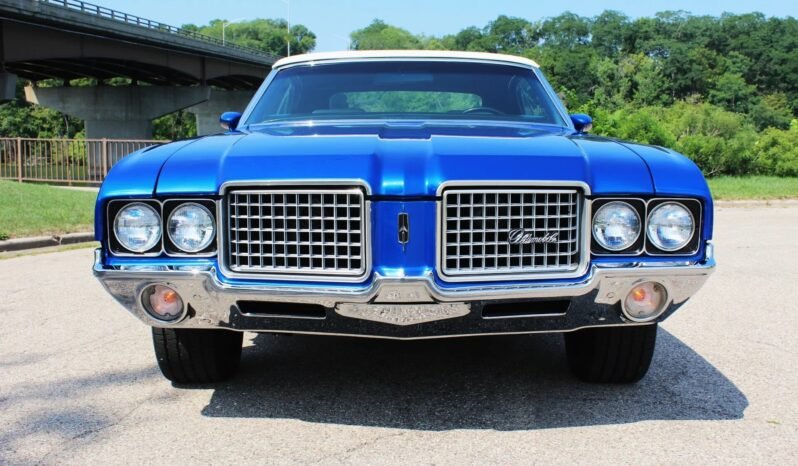 This 1972 Oldsmobile Cutlass Supreme is one of 66 convertible examples produced with the 455ci V8 paired with an M20 four-speed manual transmission for the model year. Finished in blue over white vinyl upholstery, the car is equipped with a white soft top, 15″ Super Stock II-style wheels, power steering, power-assisted front disc brakes, a stainless-steel exhaust system, air conditioning, and a push-button AM/FM radio. The car was refurbished.