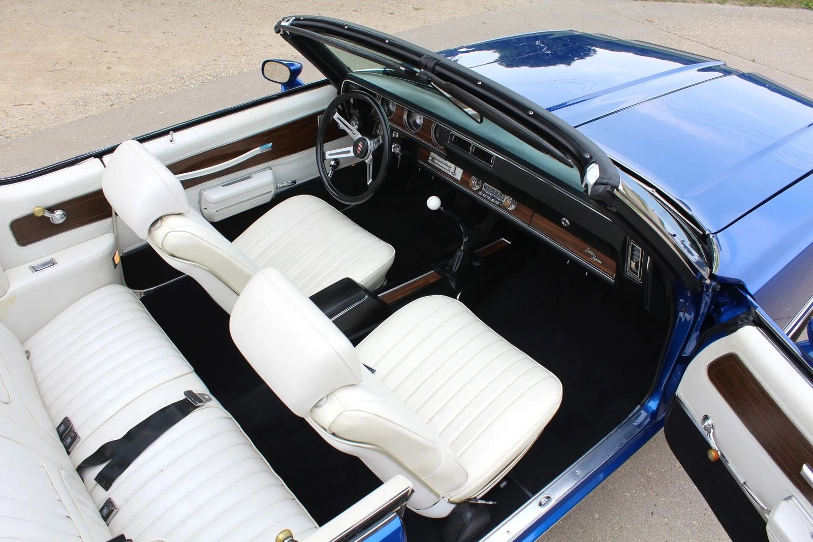 The interior features front bucket seats and a rear bench trimmed in white vinyl upholstery complimented by faux woodgrain trim that accents the dashboard, center console, and door panels. Cutlass-branded floor mats line the footwells, and appointments include air conditioning, retractible front lap belts, a Hurst shifter, a locking glove compartment, and a push-button AM/FM radio.