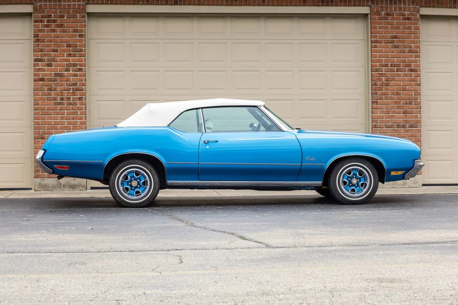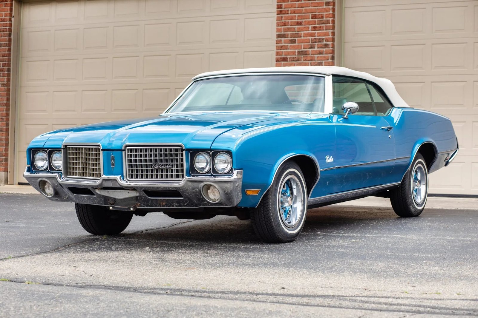 This 1972 Oldsmobile Cutlass Supreme convertible is powered by a 350ci V8 linked to a three-speed automatic transmission and is finished in blue over white vinyl upholstery. Equipment includes a power-operated white soft top in addition to 14″ wheels with body-color spokes, front disc brakes, air conditioning, cruise control, a locking center storage console, and a push-button AM/FM radio.