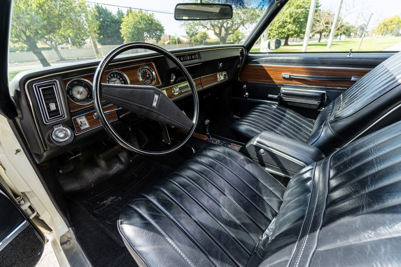 Faux-woodgrain veneers accent the cabin, and a Hurst/Olds 1972 Indianapolis 500 pace car badge is affixed to the passenger-side of the dashboard. Additional