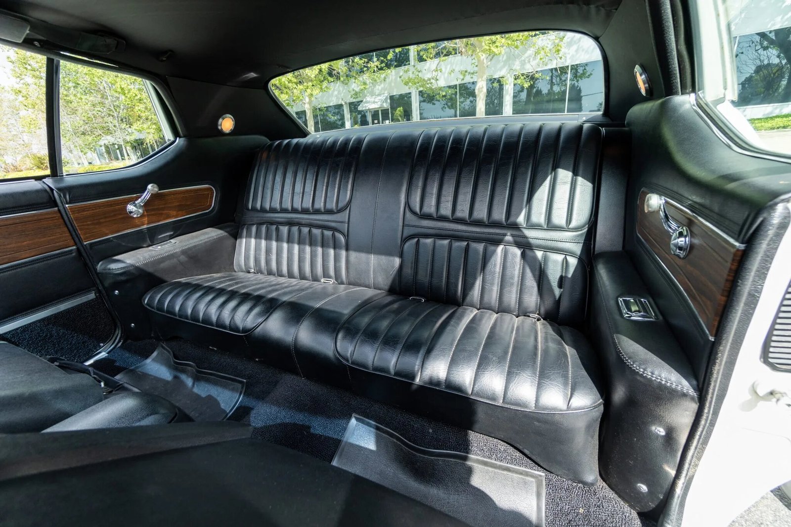 The interior features front bucket seats and a rear bench upholstered in black vinyl with a matching dashboard, center console, door panels, and carpets.