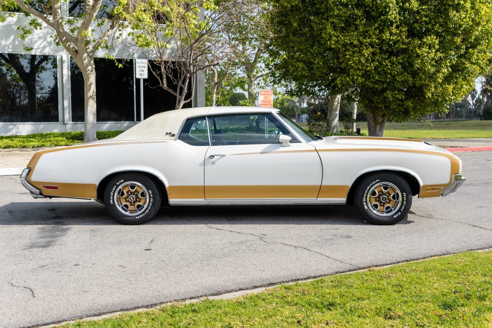 The car is finished in Cameo White (11) with taped-on Hurst Gold stripes and Hurst/Olds badging as well as a vinyl roof.
