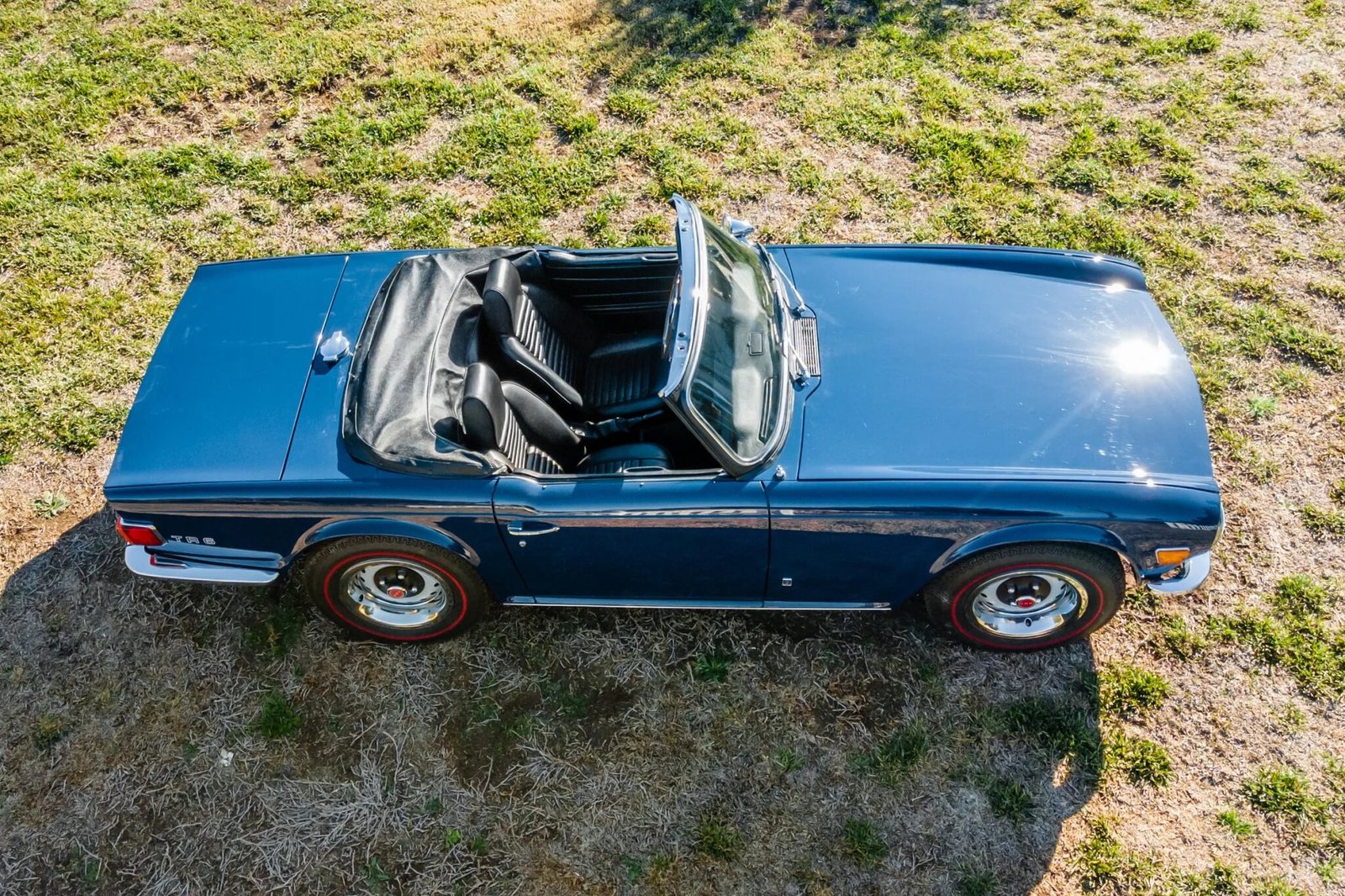A replacement black soft top with a zip-out rear window was installed, and additional equipment includes TR6 decals on the rear quarter panels, chrome front and rear bumpers, and a bullet-style driver-side mirror.