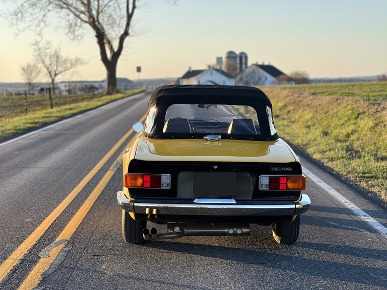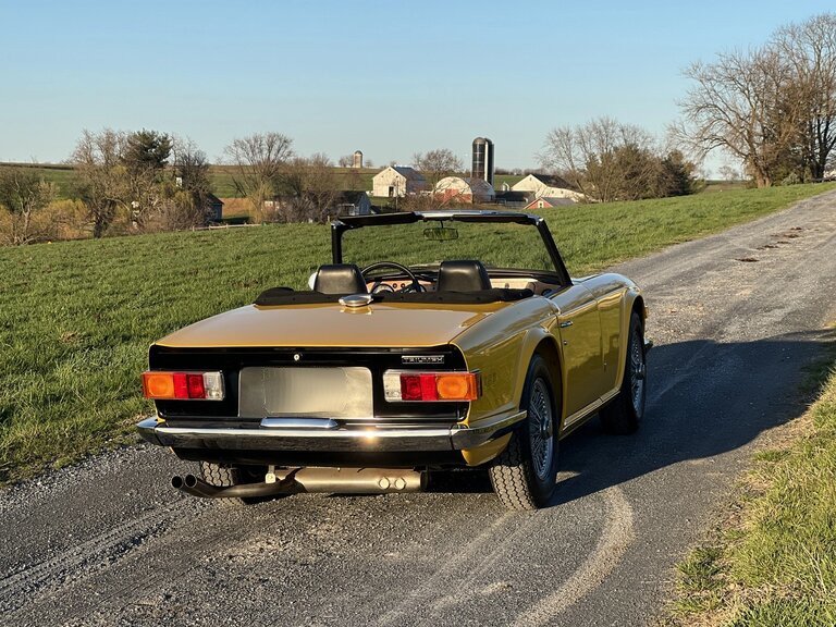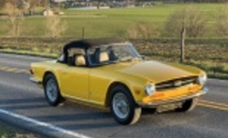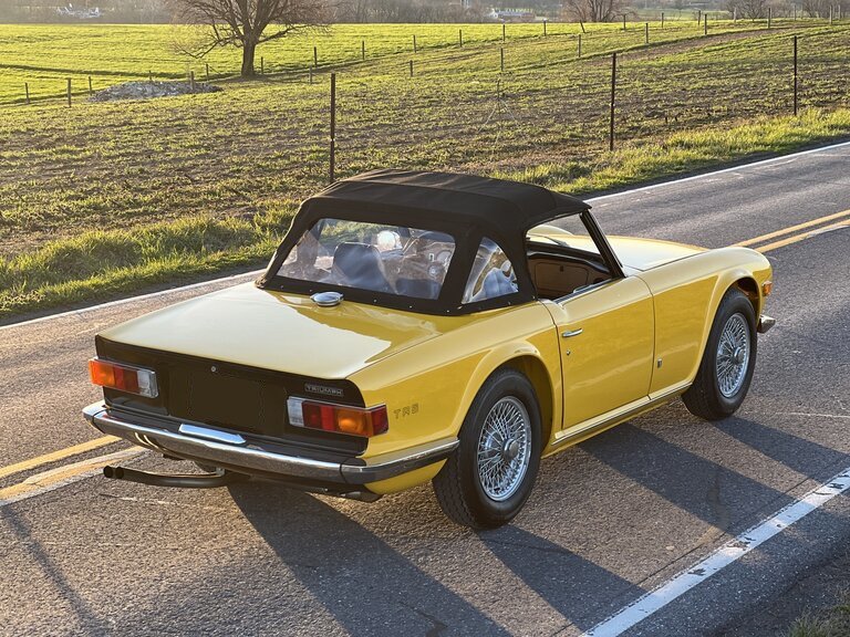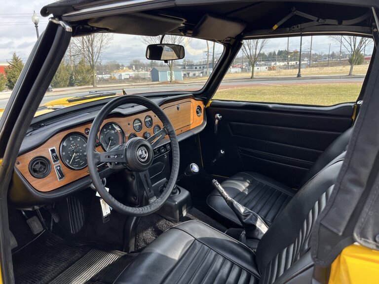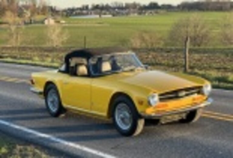 This 1972 Triumph TR6 was refurbished with work consisting of repainting the body in yellow, reupholstering the interior in black vinyl, sandblasting the frame, and rebuilding the 2.5-liter inline-six. Additional equipment includes a four-speed manual transmission, twin Zenith-Stromberg carburetors, silver-finished 15″ wire wheels, power-assisted front disc brakes, a wood veneer dashboard panel, and a heater. Work included boring the cylinders 0.030″ and installing replacement pistons along with cleaning the intake and exhaust manifolds, refacing the valves and seats, installing bronze valve guides, and replacing the main and rod bearings, crankshaft and camshaft sprockets, valve seals, and gaskets.